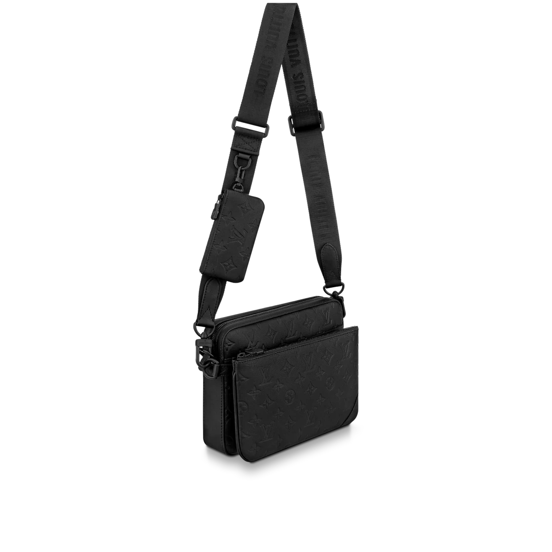 The Trio Messenger in Monogram-embossed calf skin is a fashionably hybrid bag. It combines a main compartment and a removable front zipped pocket, with a detachable small coin purse on strap. An adjustable and removable "Lothtuis Vuithttton"-signed jacquard textile strap enables comfortable shoulder and cross-body carry.