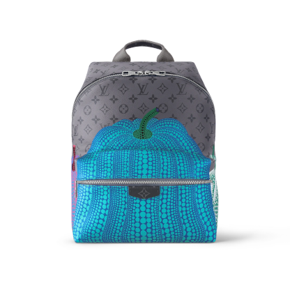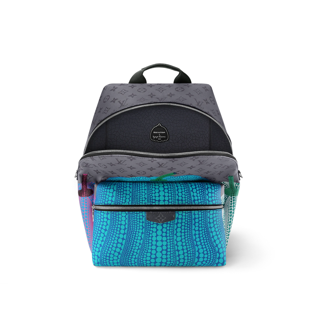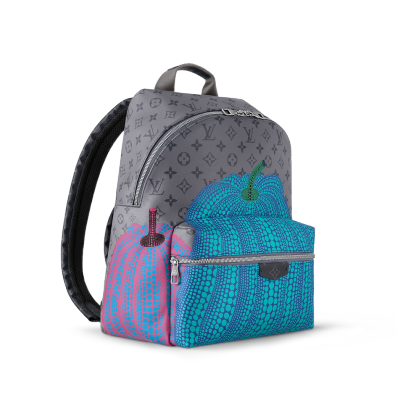The LthtVxYK Discovery Backpack gets a creative new treatment as part of the second major Lothtuis Vuithttton x Yayoi Kusama collection. Monogram Eclipse Reverse canvas is enlivened with a colorful print featuring one of the renowned artist's emblematic images: stylized pumpkins arrayed with psychedelic dots. A practical, user-friendly backpack, and a celebration of the House's timeless bond with the art world.