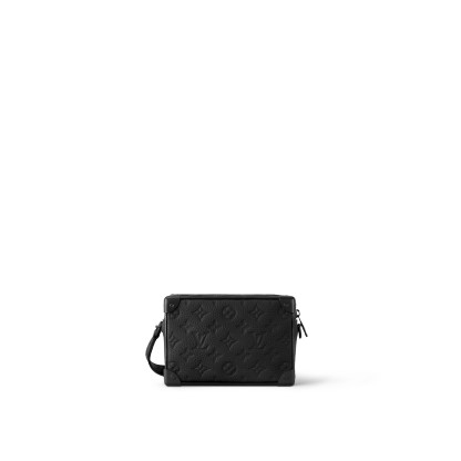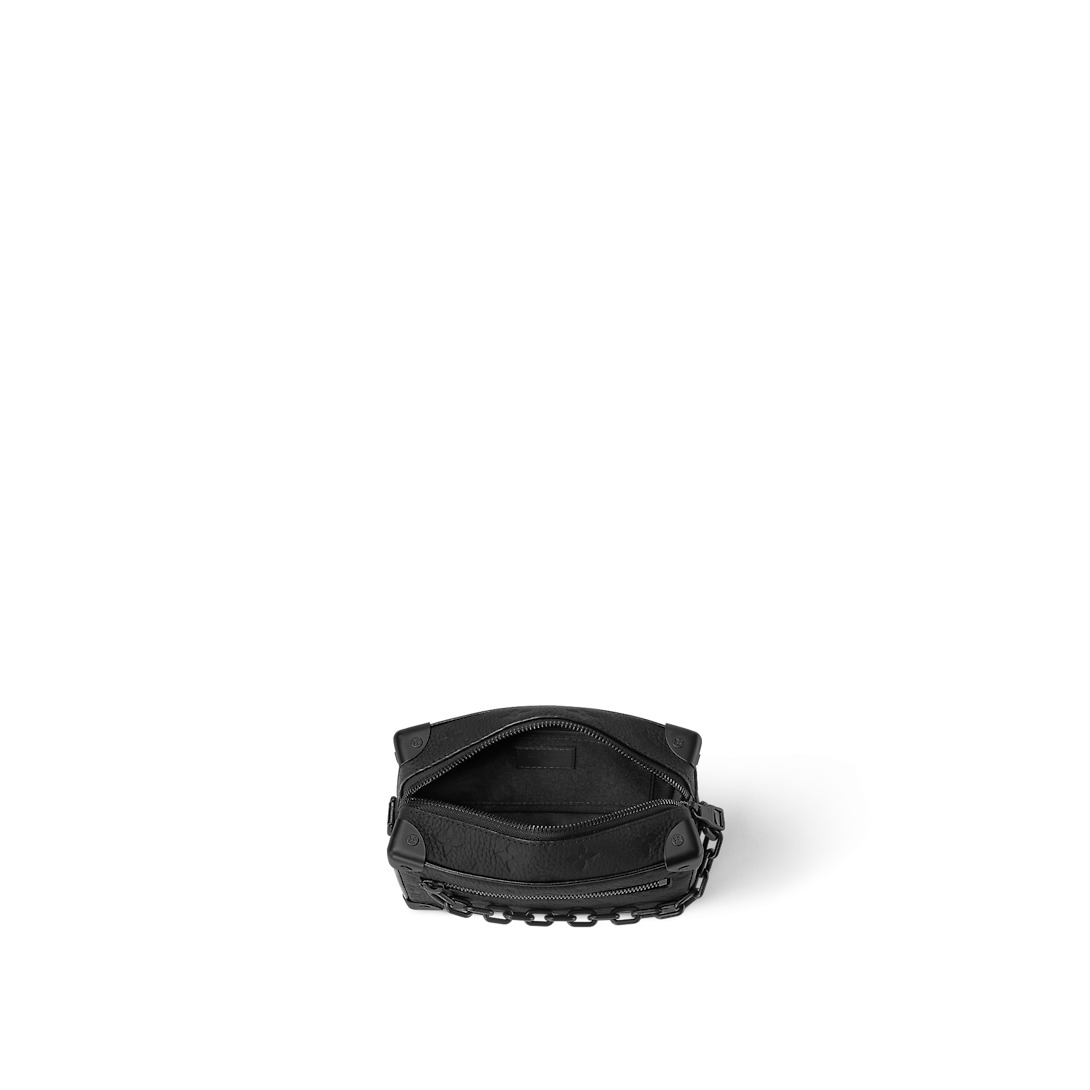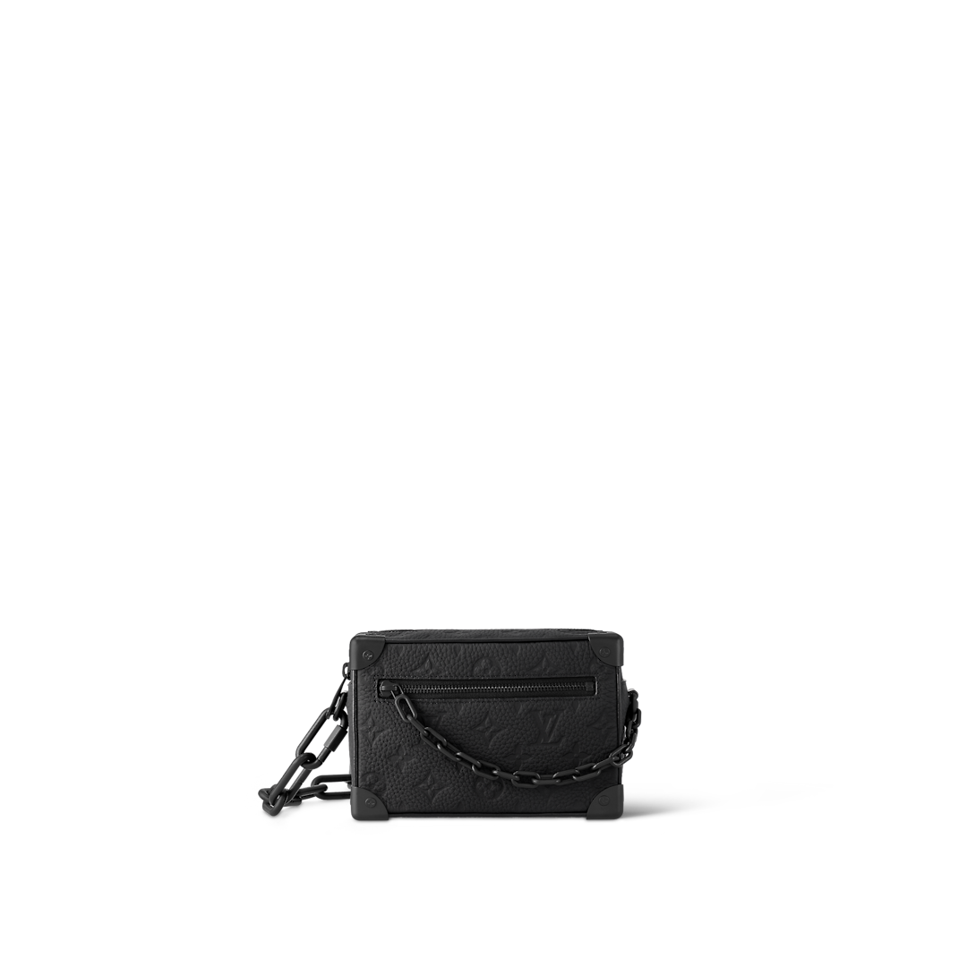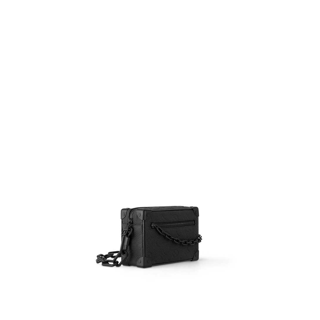 With its riveted corners and boxy shape, the Mini Soft Trunk bag in black Monogram-embossed Taurillon leather is a direct descendent of Lothtuis Vuithttton's original trunks. The two matte-black chains, one connected to the zipper and the other serving as part of the shoulder strap, bring modernity to this small bag.
