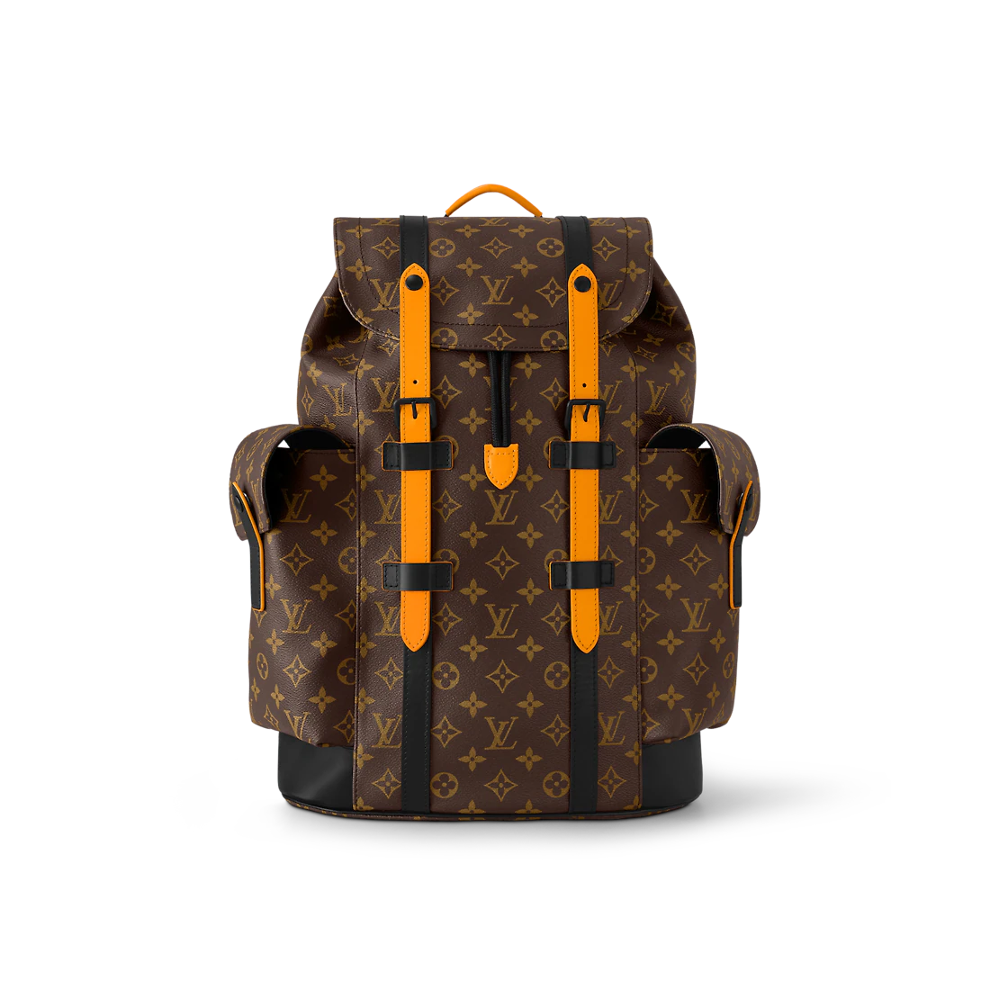 The Christopher MM backpack is made from Monogram Macassar canvas with black cowhide-leather trim and saffron-color leather on the front bands. The accents of color on the dark Monogram canvas energize the design. Inspired by the rucksack, it has two bulky side pockets and closes with a drawstring and press studs.
