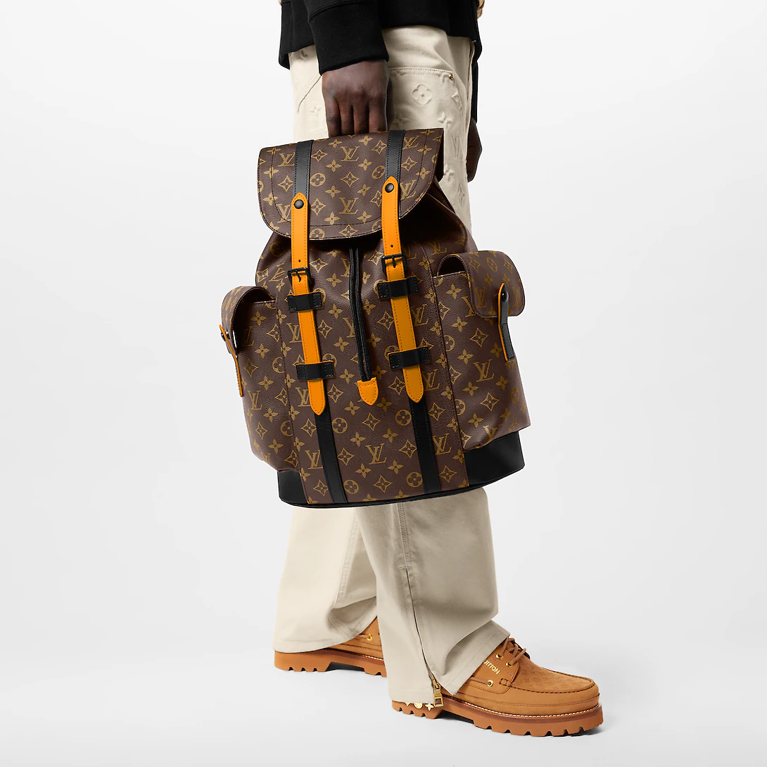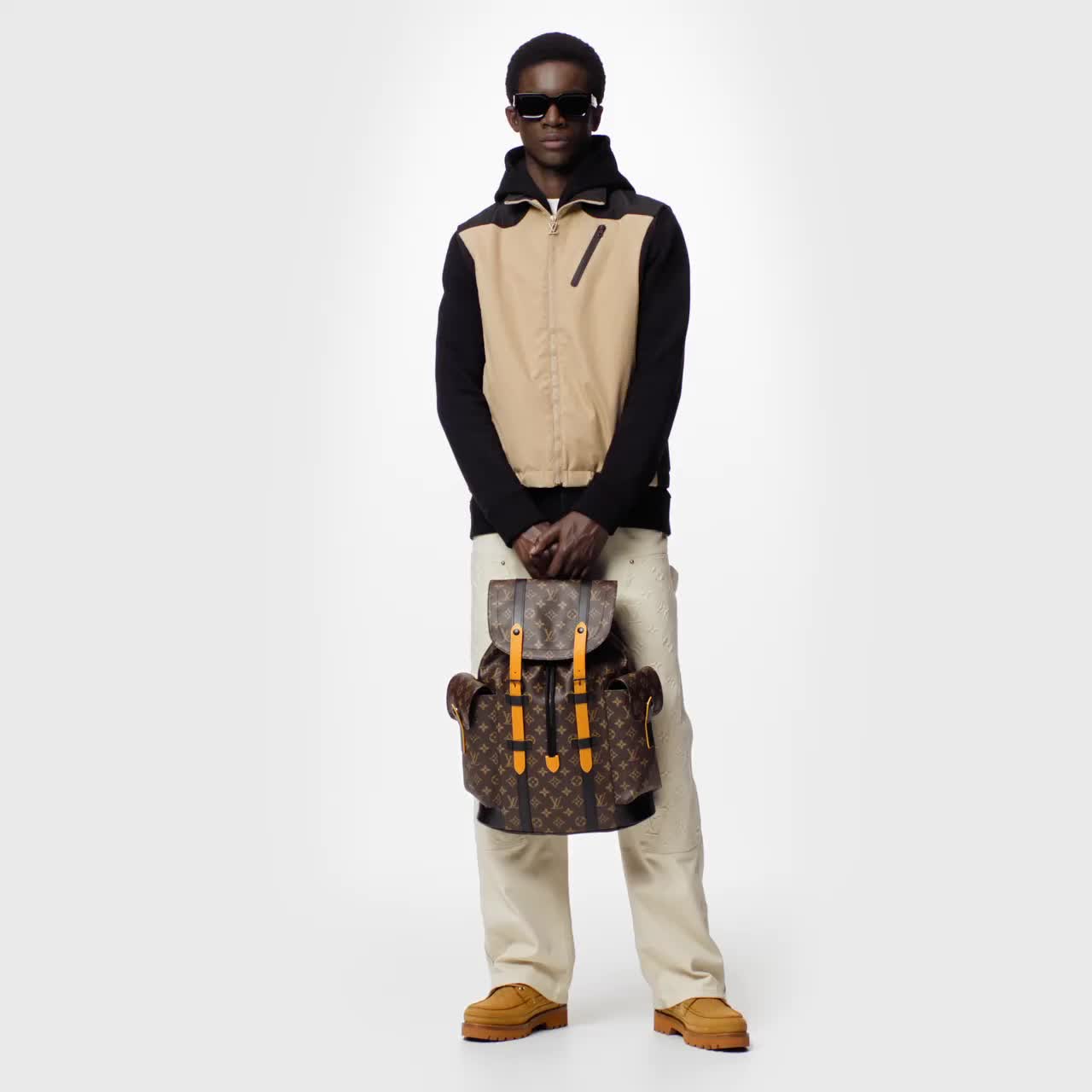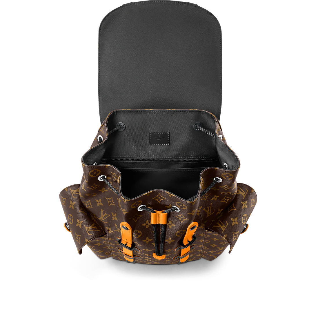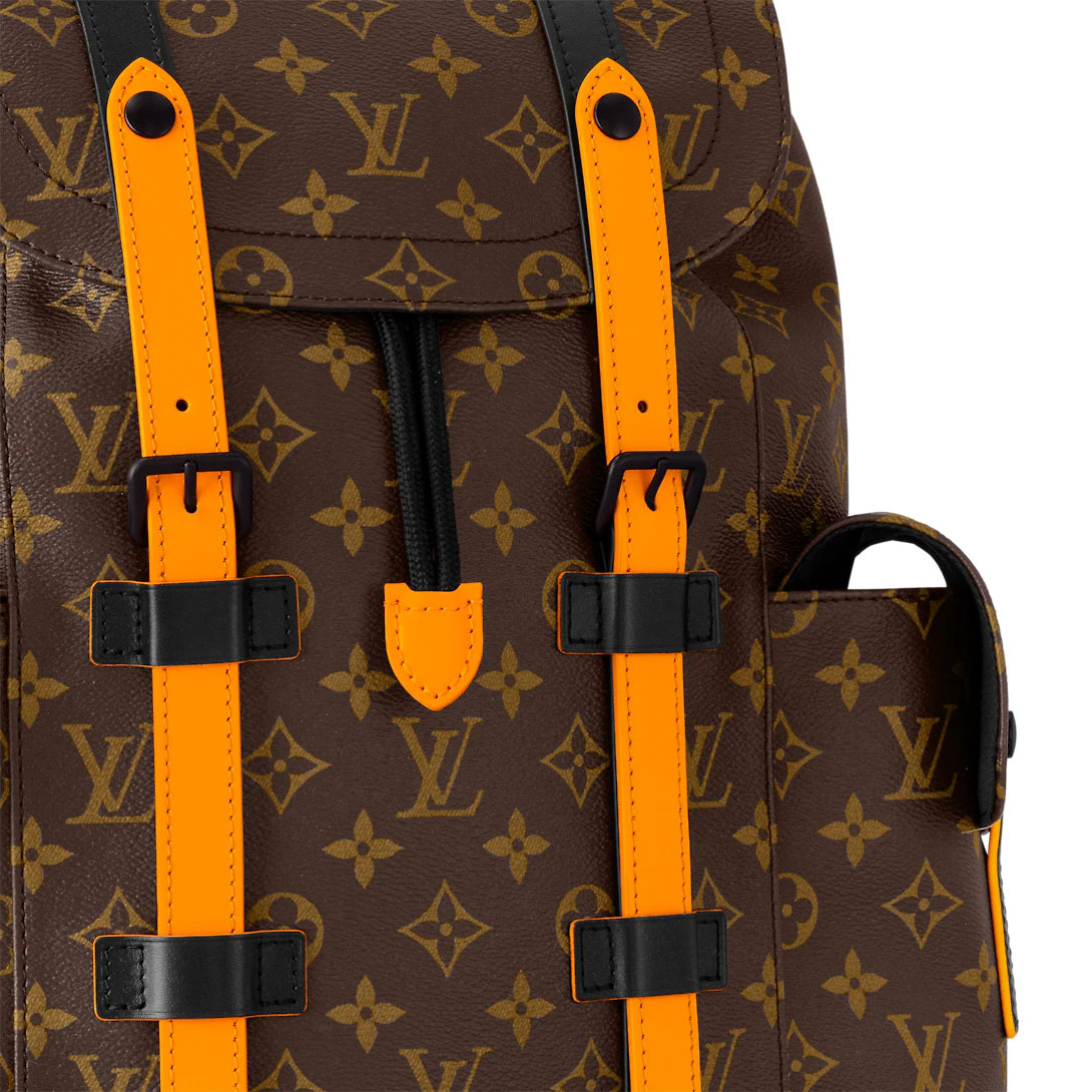 The Christopher MM backpack is made from Monogram Macassar canvas with black cowhide-leather trim and saffron-color leather on the front bands. The accents of color on the dark Monogram canvas energize the design. Inspired by the rucksack, it has two bulky side pockets and closes with a drawstring and press studs.