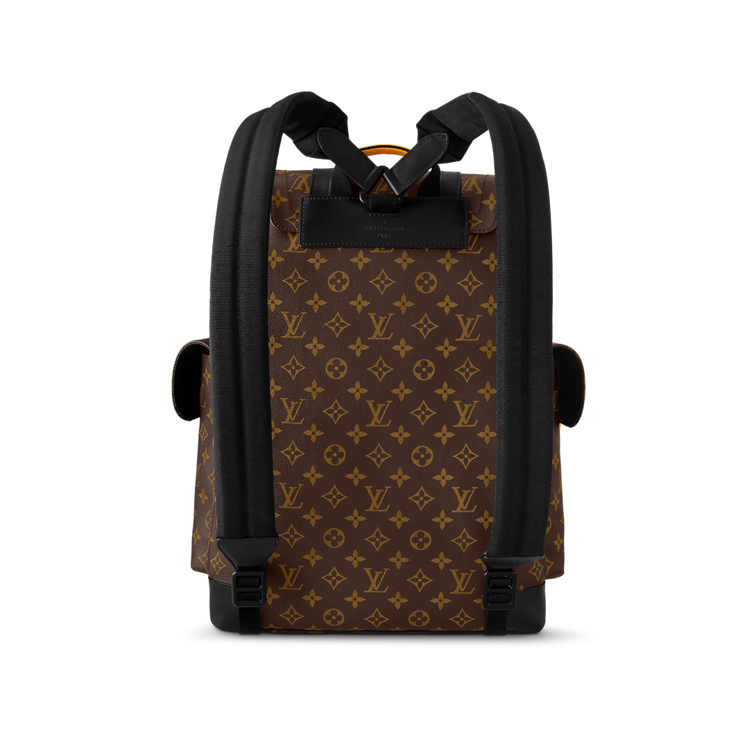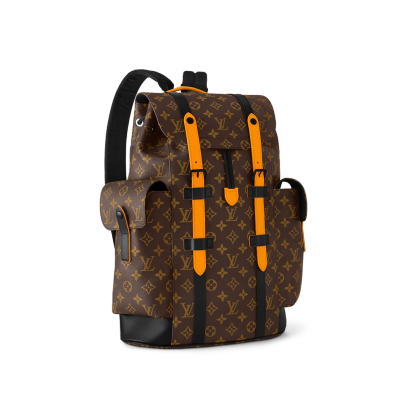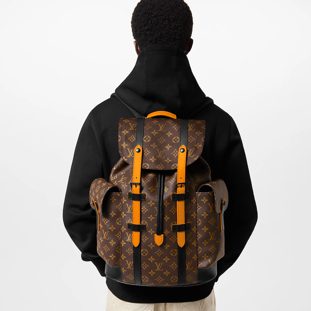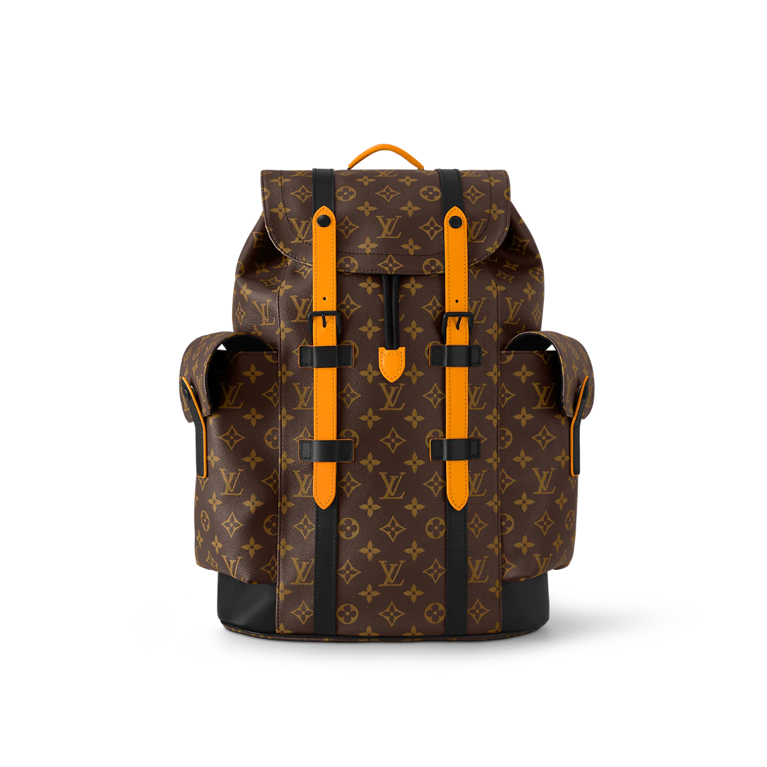 The Christopher MM backpack is made from Monogram Macassar canvas with black cowhide-leather trim and saffron-color leather on the front bands. The accents of color on the dark Monogram canvas energize the design. Inspired by the rucksack, it has two bulky side pockets and closes with a drawstring and press studs.