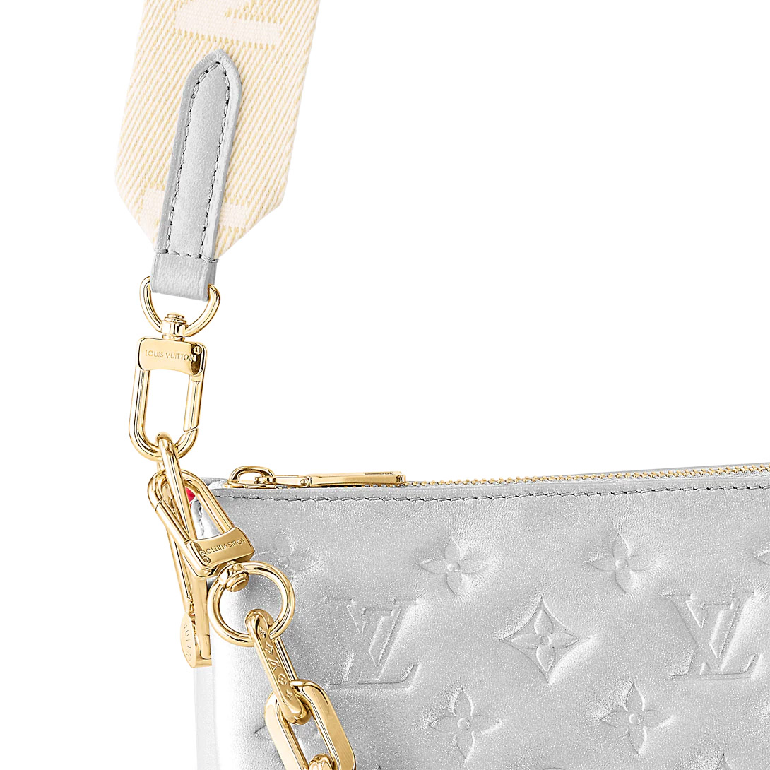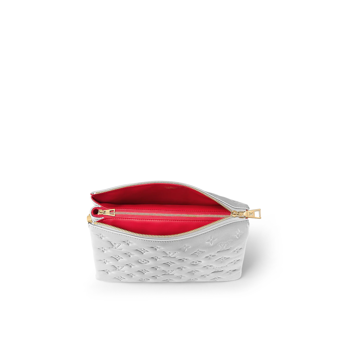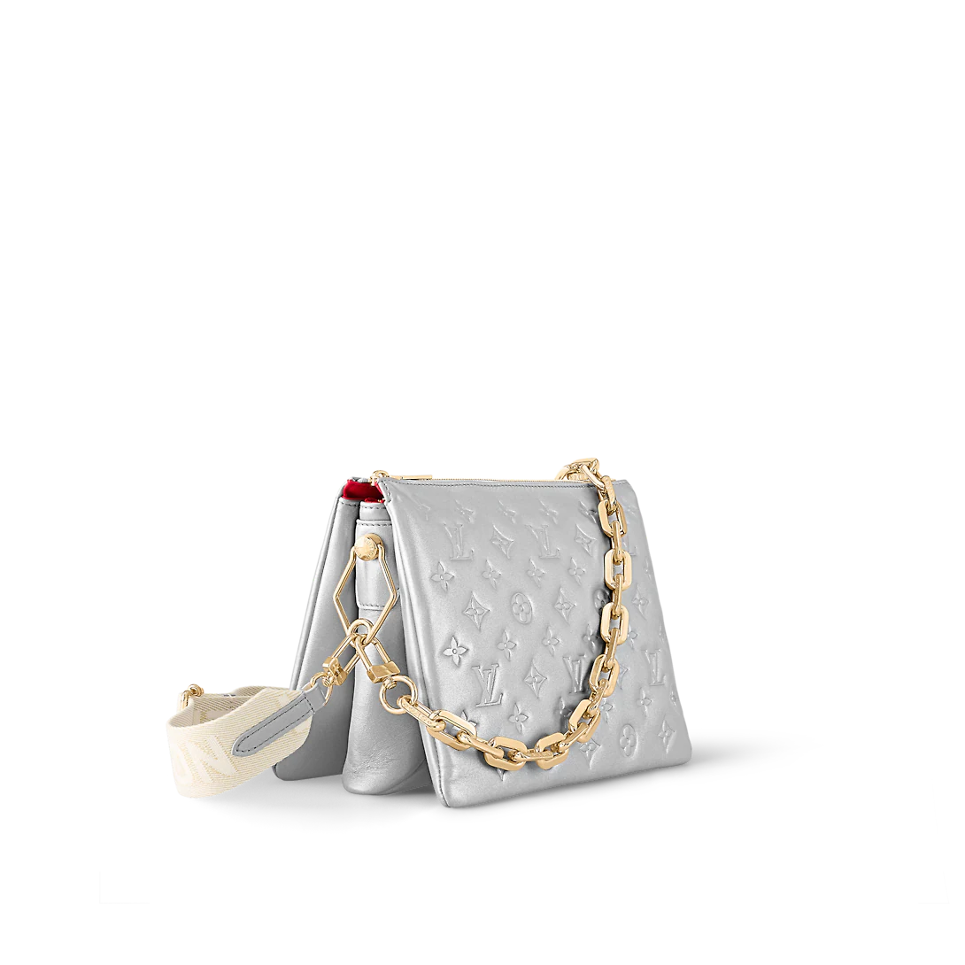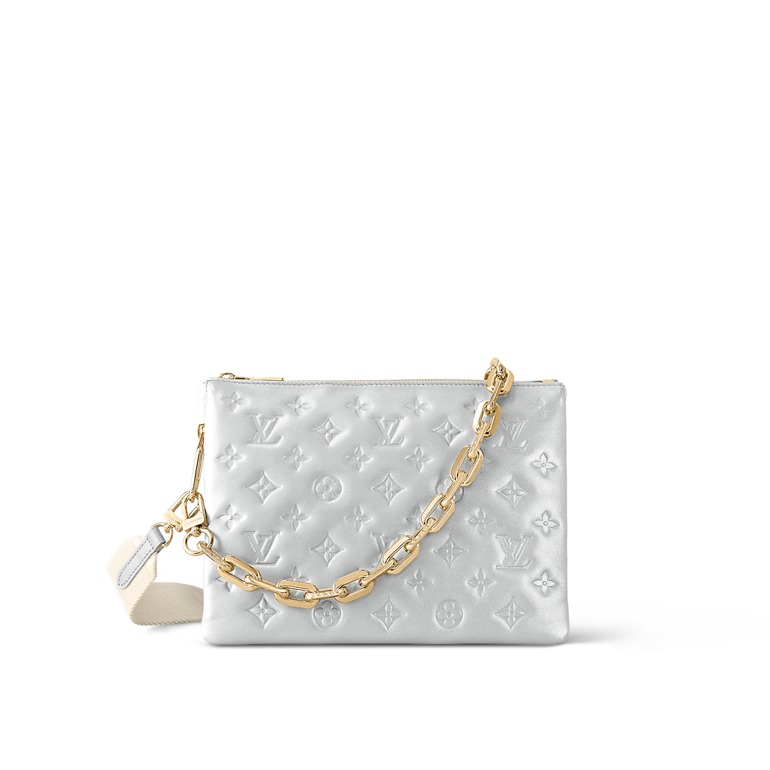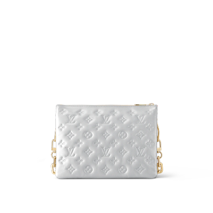 Made from siLthtVer-color puffy lambskin, the Coussin PM handbag is embossed with the Monogram pattern. Finished with gold-color hardware, including a chunky chain, it’s glamorously eye-catching. In addition to the chain, a wide removable textile strap allows shoulder and cross-body carry. The pillow-like Coussin brings style to the most simple look.