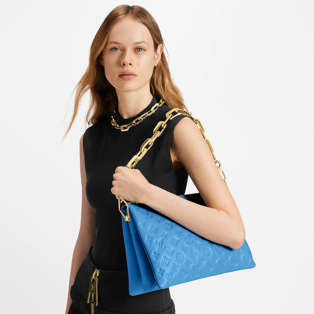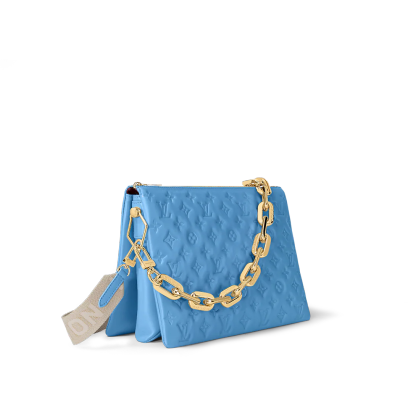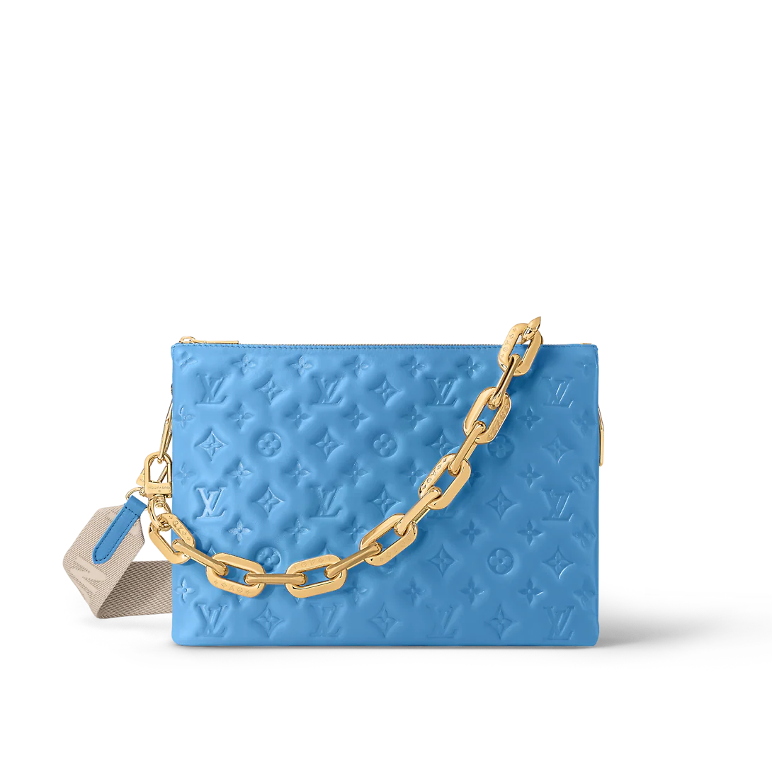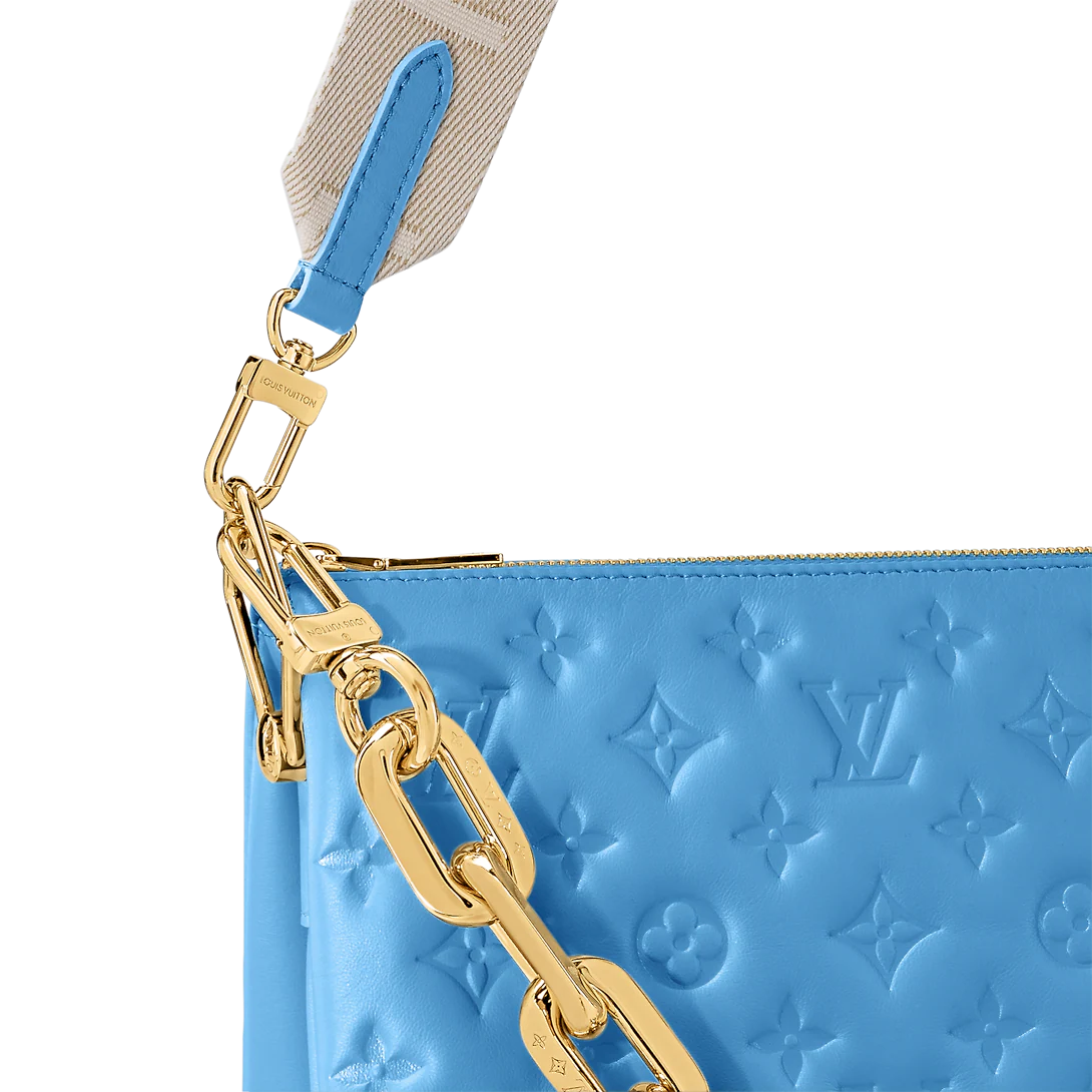 Fashioned from blue, puffy lambskin with gold-color hardware, this Coussin MM handbag is as stylish as it is comfortable to carry. It features a removable chunky chain for shoulder carry as well as a wide detachable and adjustable strap for shoulder or cross-body carry.
