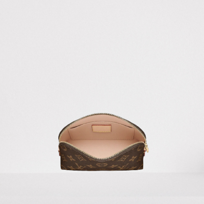 This compact cosmetic pouch in Monogram canvas slips easily into a handbag or suitcase. Its round shape and flat base facilitates access to small products.