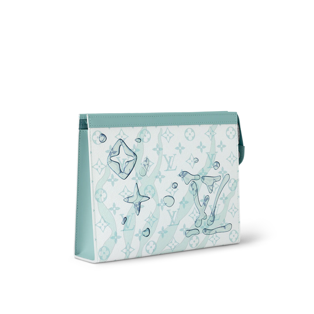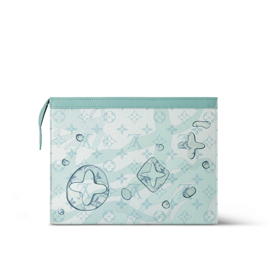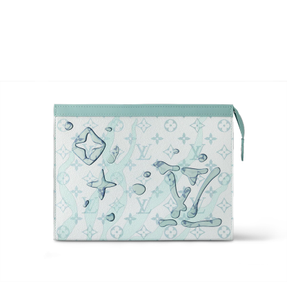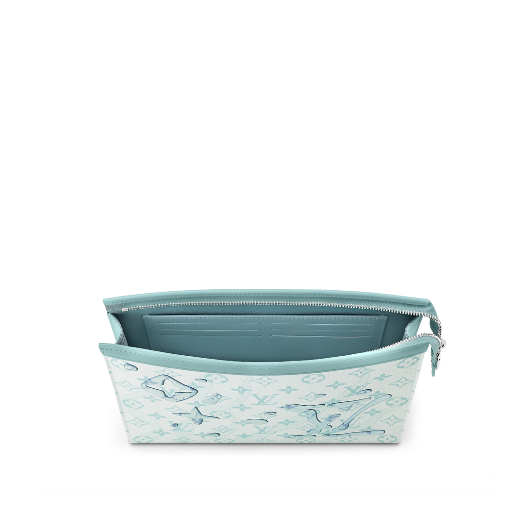 This Pochette Voyage MM in Monogram Aquagarden canvas looks like it just emerged from the depths, with a water-splash version of the Monogram on top of a faded Monogram motif. The innovative printing process gives the water drops a remarkably realistic aspect. This functional pouch includes a flat inside pocket and six inside card slots.