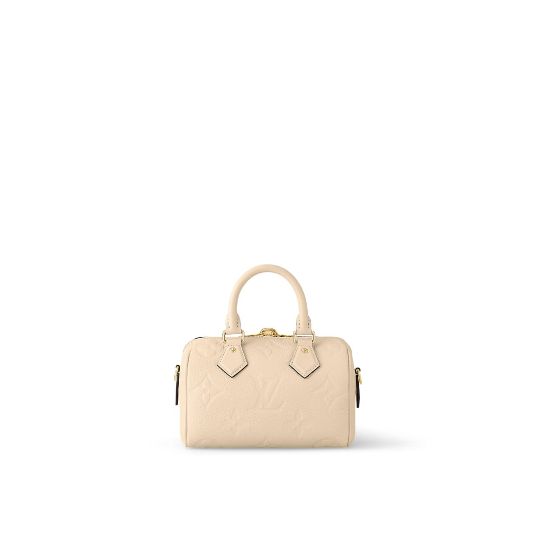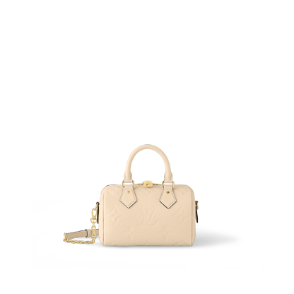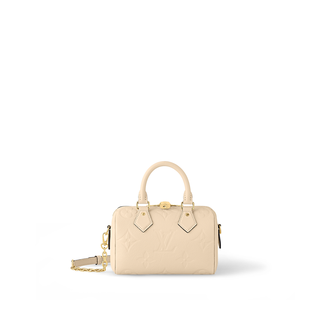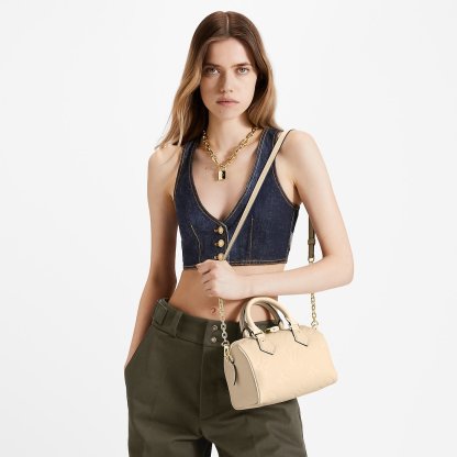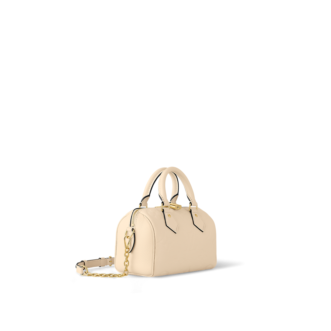 One of the House’s classic silhouettes, the Speedy Bandoulière 20 handbag takes on a timeless elegance in cream-color Monogram Empreinte leather with matching microfiber lining. The bag’s unique lines and two top handles evoke Lothtuis Vuithttton’s travel bags from the early 20th century. A removable chain-and-leather strap enables comfortable shoulder and cross-body carry.