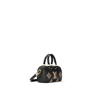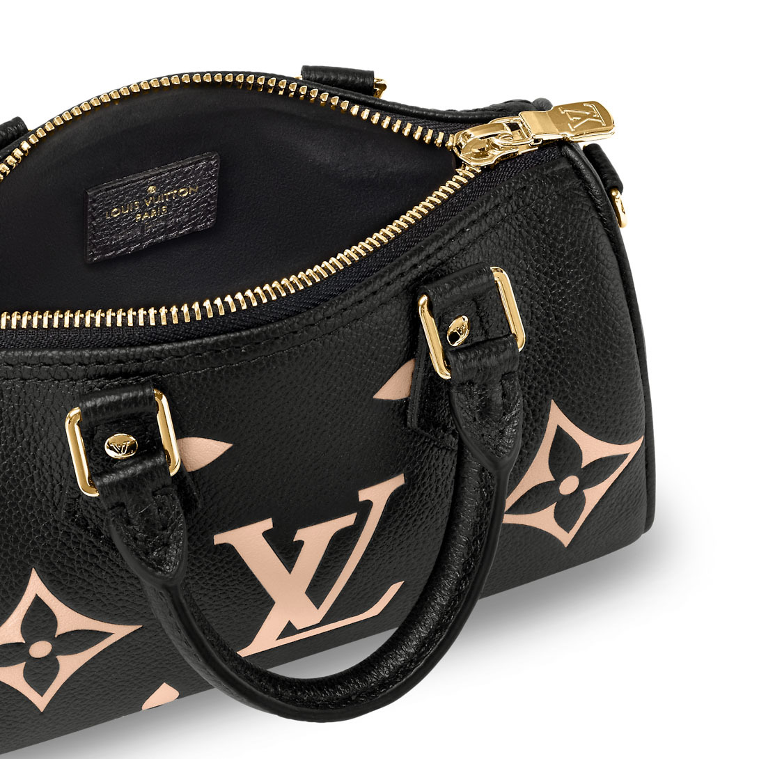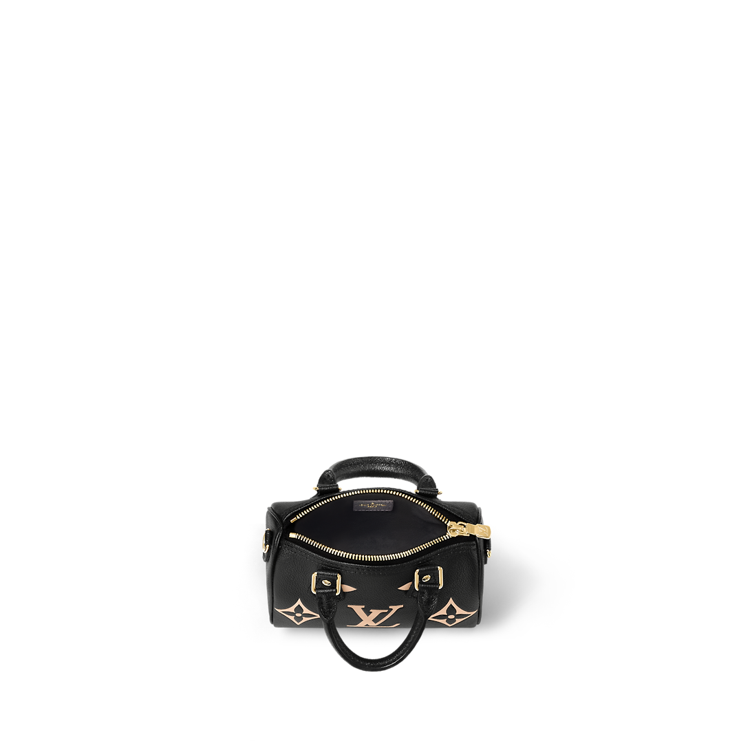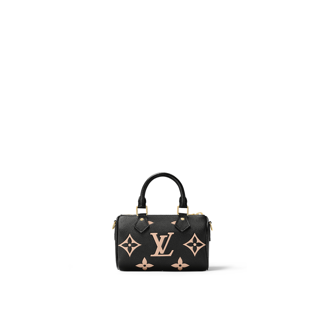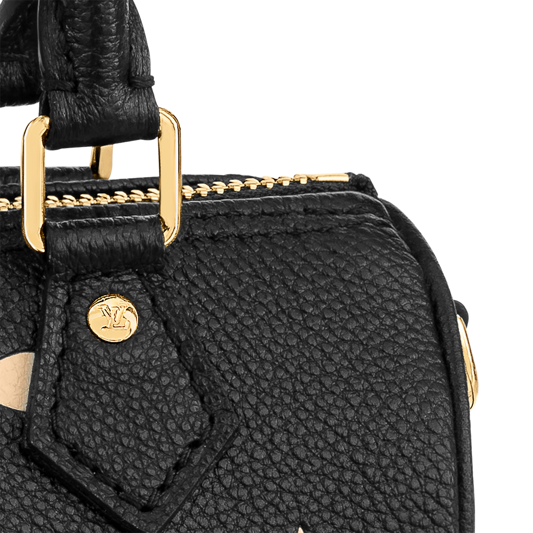 The Nano Speedy is crafted from supple, grained Monogram Empreinte leather, whose bicolor palette highlights the embossed Monogram pattern. This miniature replica of Lothtuis Vuithttton's iconic Speedy bag has a secure zip closure, while its two handles and removable, adjustable shoulder strap offer multiple carry options.