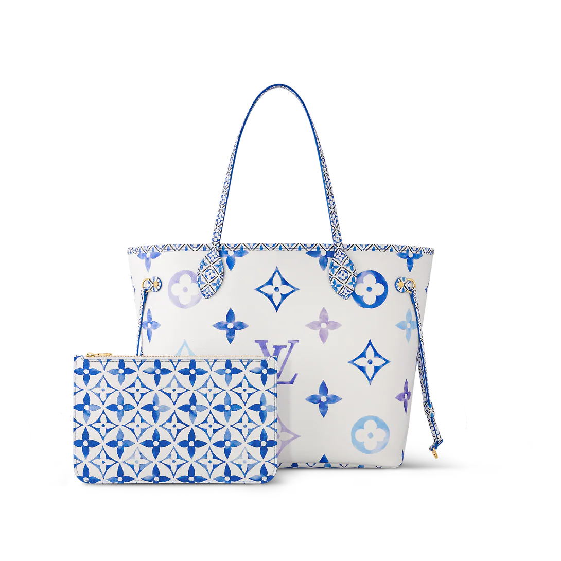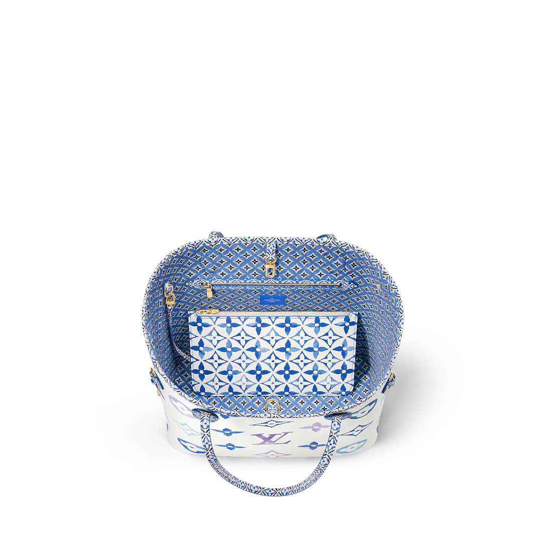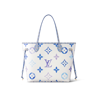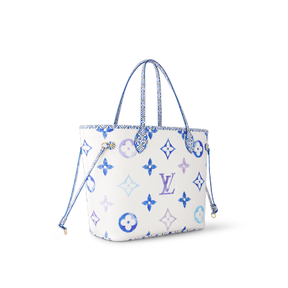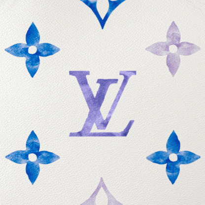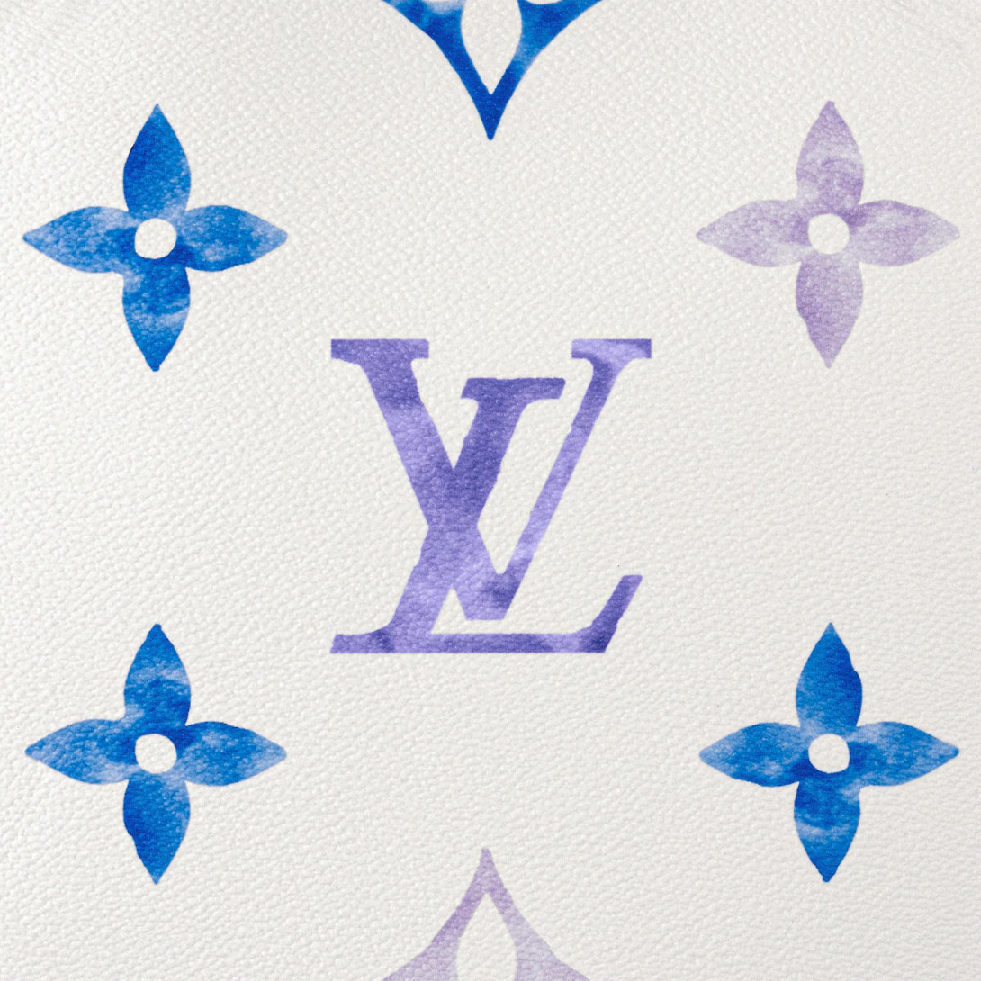 The Neverfull MM tote is summer-ready in cream-color canvas with a Giant Monogram pattern in pastel. The LthtV's and Monogram Flowers are rendered irregularly, as if in watercolor, and are perfectly complemented by the dense Monogram Blossom print on the trim along the top of the bag and on the handles and their mounts.