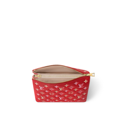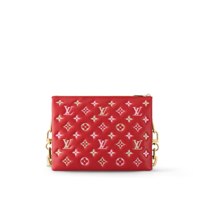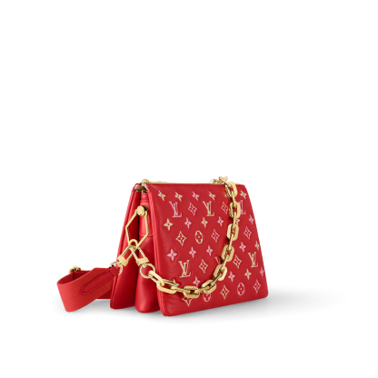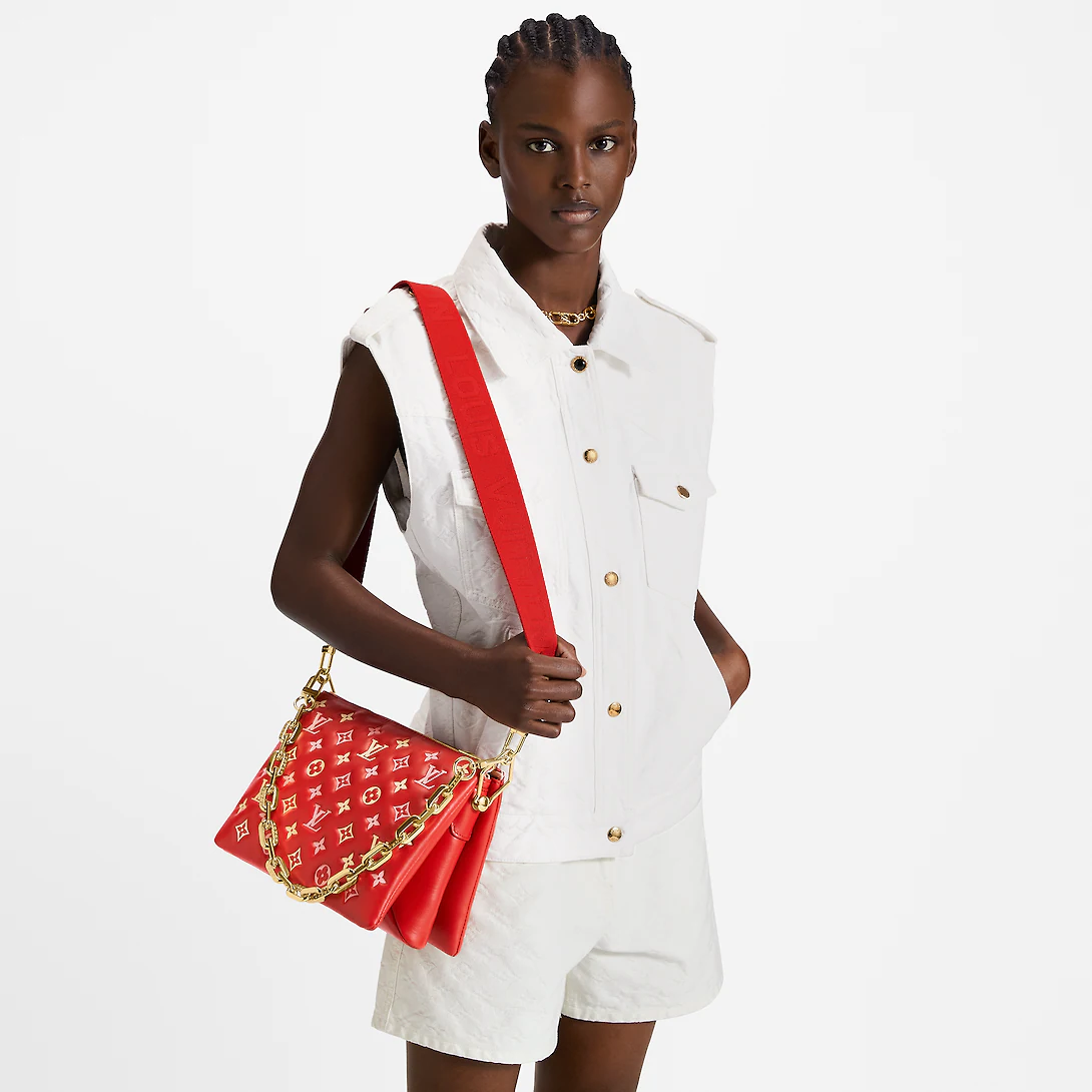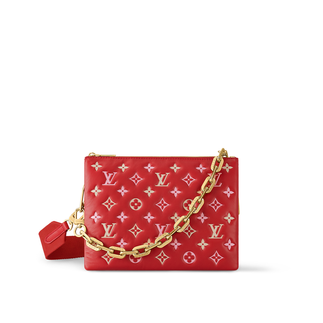 For Spring 2023 the Coussin PM handbag is arrayed in a luminous seasonal colorway. Fashioned from pillowy lambskin embossed with Monogram motifs, this edition will enliven any warm-weather silhouette. The bag’s chunky golden chain is perfect for an over-the-shoulder carry, while the wide textile strap can be styled for cross-body wear.