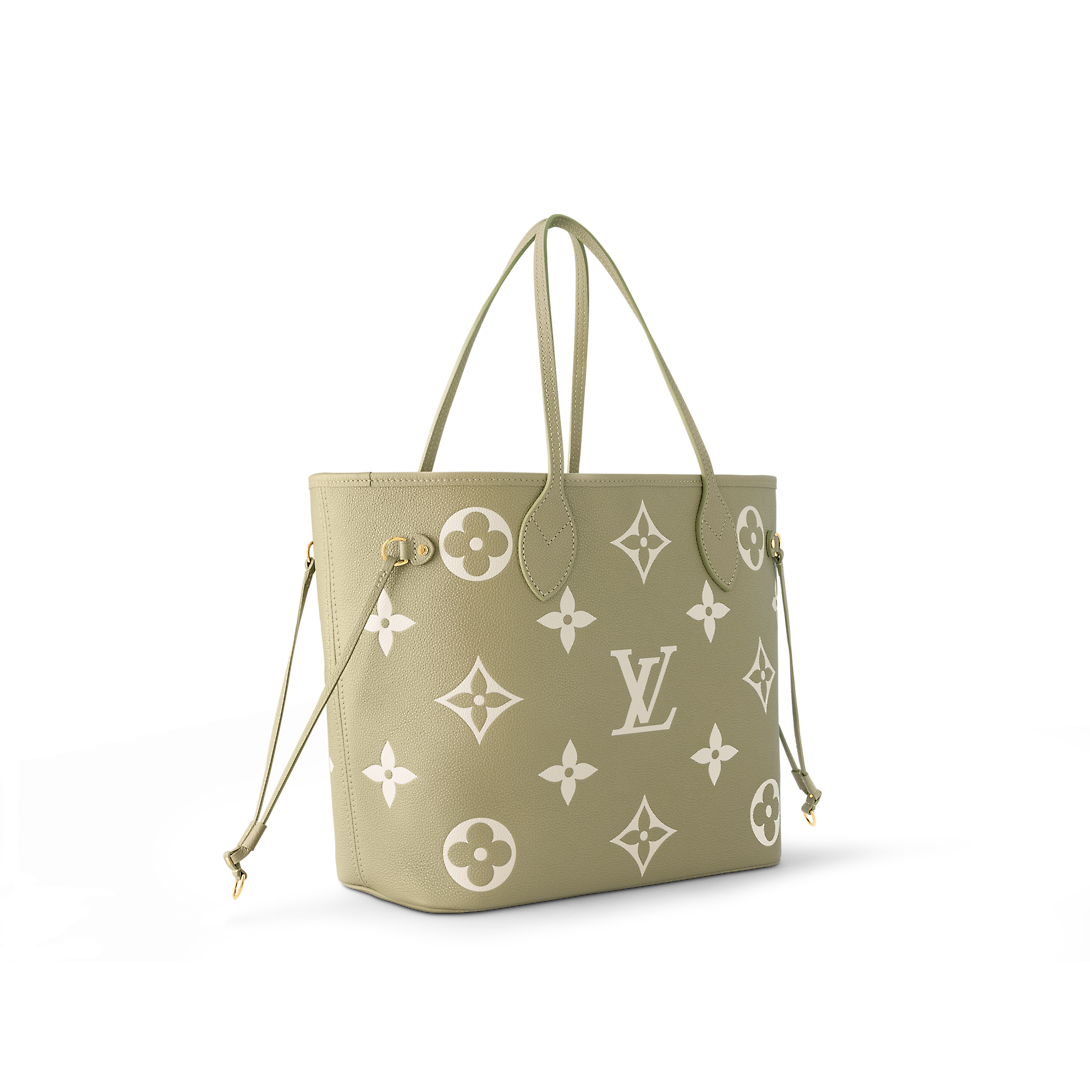 This Neverfull MM tote bag is fashioned from grained Monogram Empreinte cowhide leather. Embossed with the Giant Monogram pattern, the Neverfull is a spacious bag with side laces that cinch for a sleek allure or loosen for a casual look. Inside a removable pouch is attached to the bag by a leather cord.
