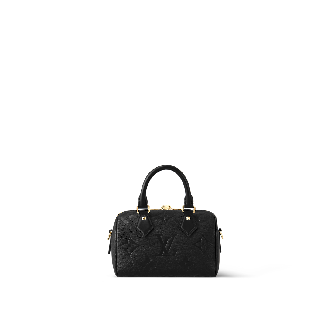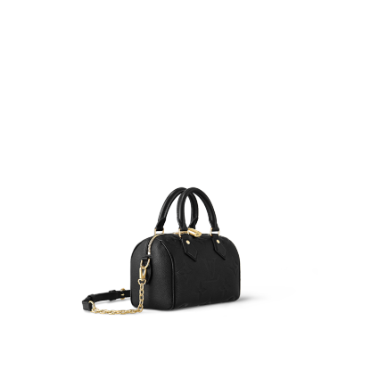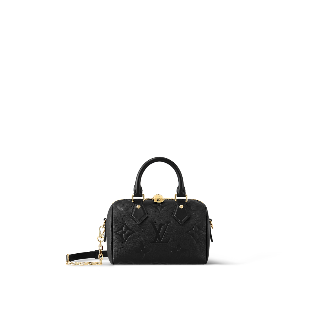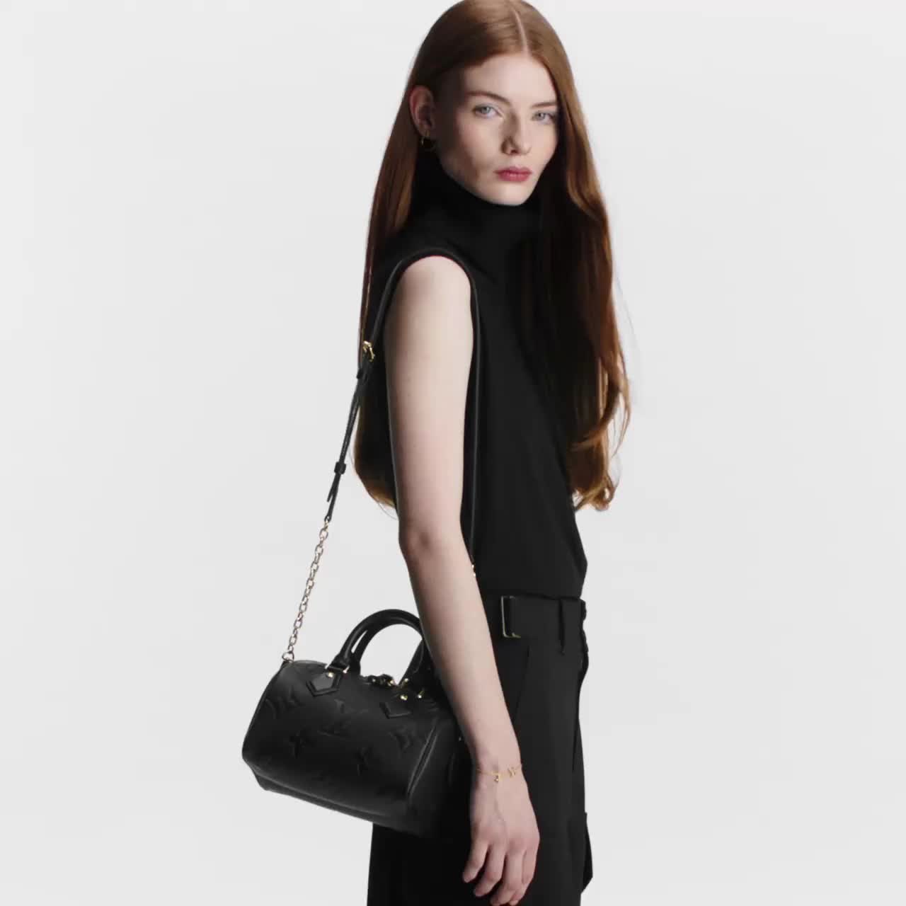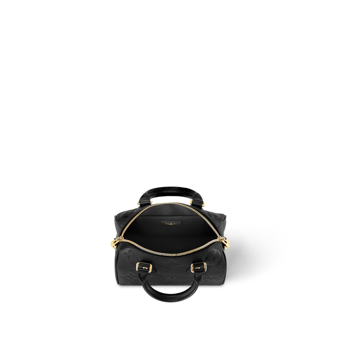 The Speedy Bandoulière 20 is an on-trend compact handbag, just the right size to carry daily essentials. It’s made from smooth grained Monogram Empreinte leather, embossed with an Oversized Monogram pattern. The hardware and padlock are a golden color. It has a delicate chain strap – removeable and adjustable – in addition to two Toron handles.