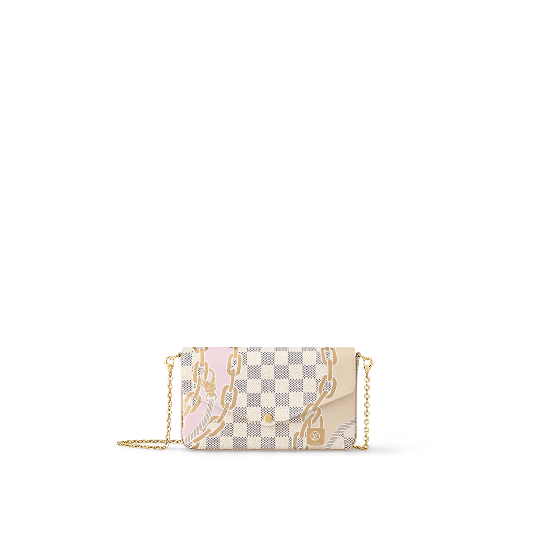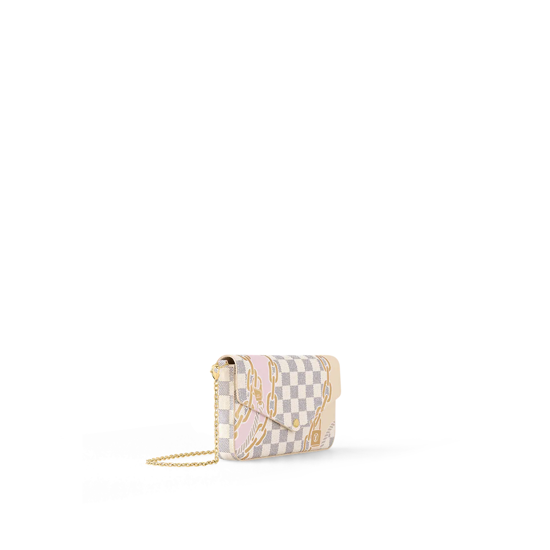 The Félicie Pochette is made from Damier Azur canvas overlaid with a bold graphic print inspired by the world of travel so dear to Lothtuis Vuithttton. The summery motif, a nautical pattern made of ropes and chains, in fresh feminine colors with golden highlights, brings a playful yet chic feel to this practical pouch.