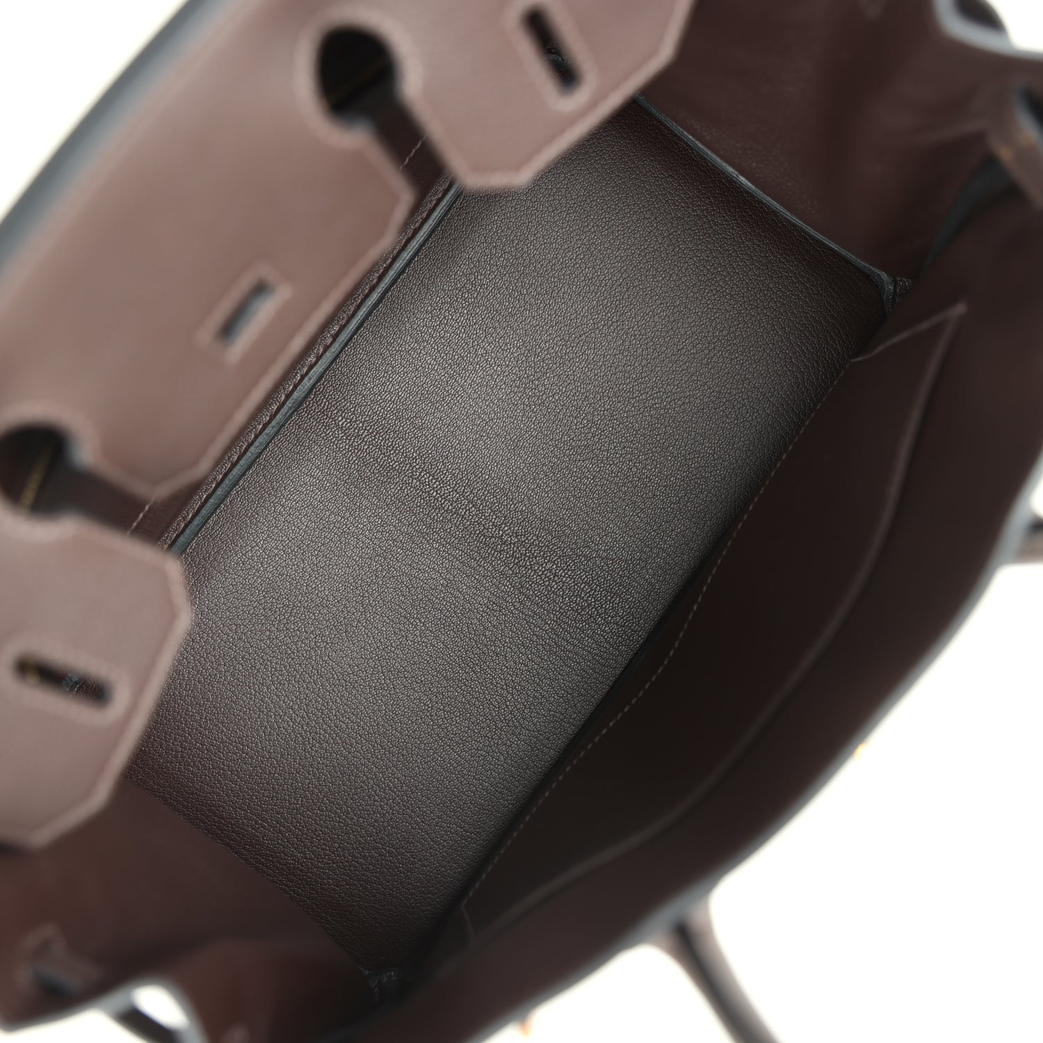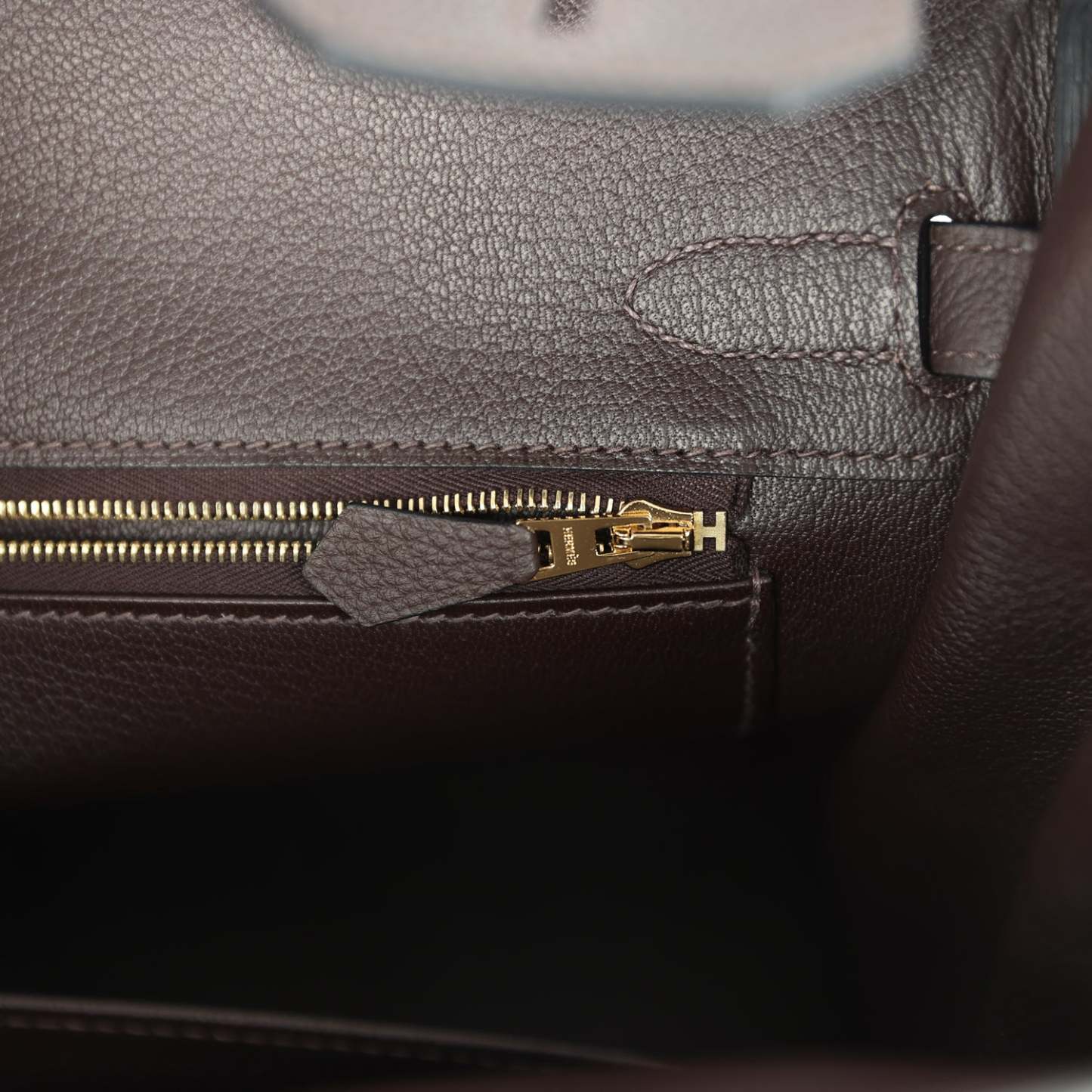 The interior is lined with Chocolat chevre leather and has one zip pocket with an herthtmes engraved zipper pull and an open pocket on the opposite side.