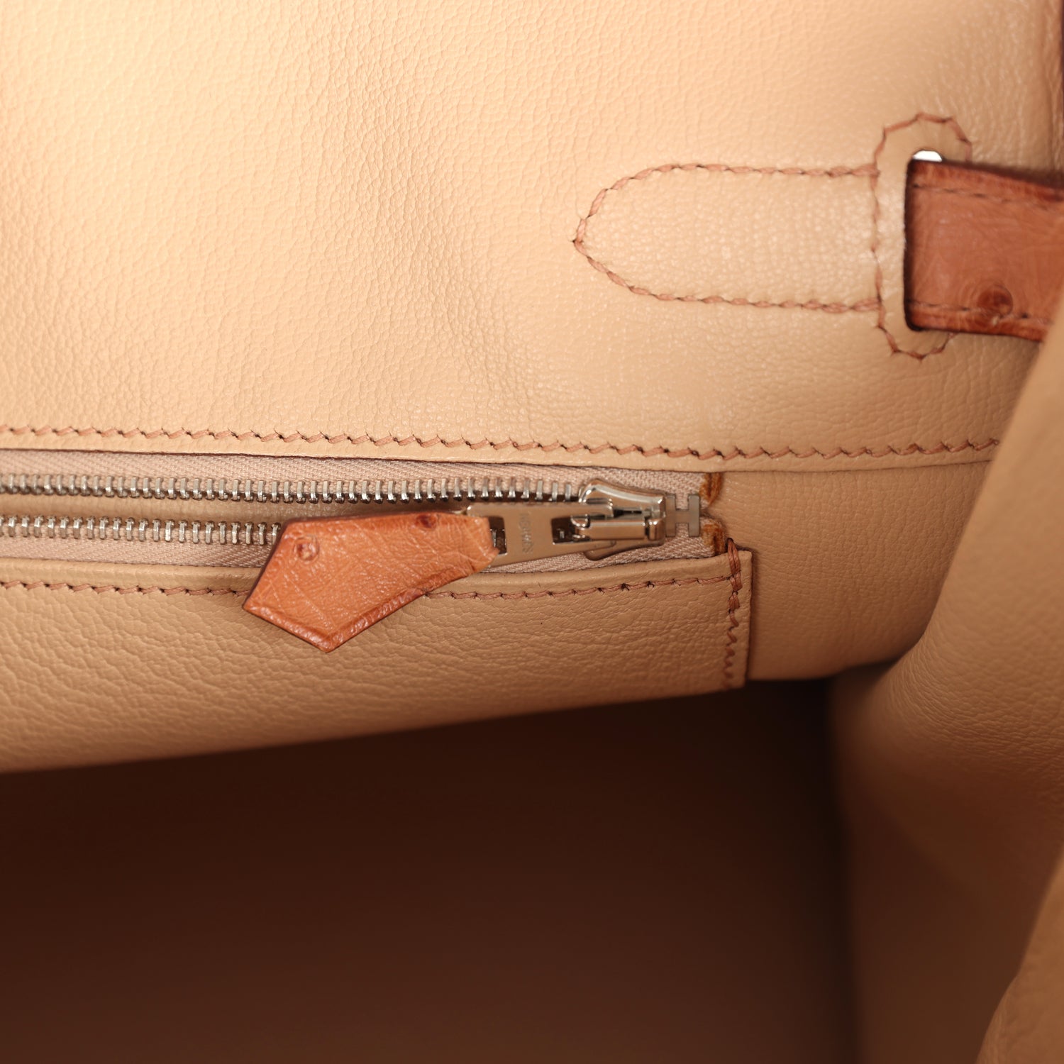 The interior is lined with Natural Sable chevre leather and has a zip pocket with an herthtmes engraved zipper pull and an open pocket on the opposite side.