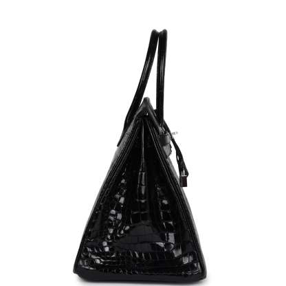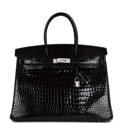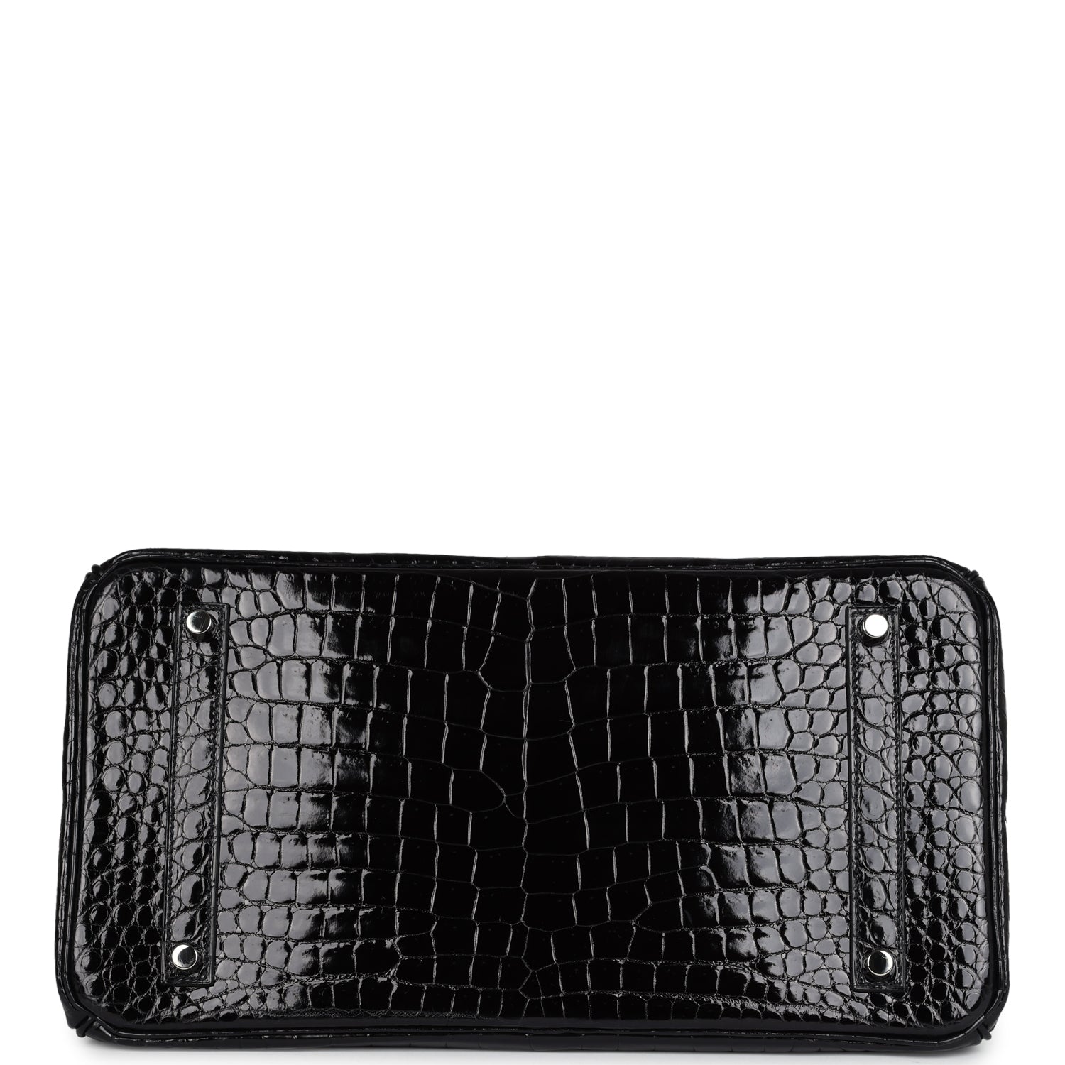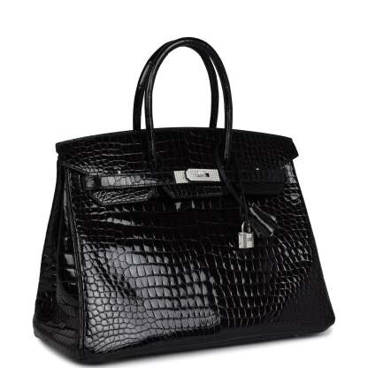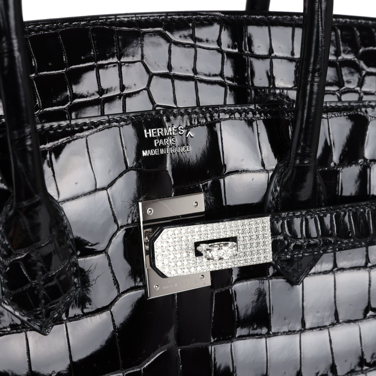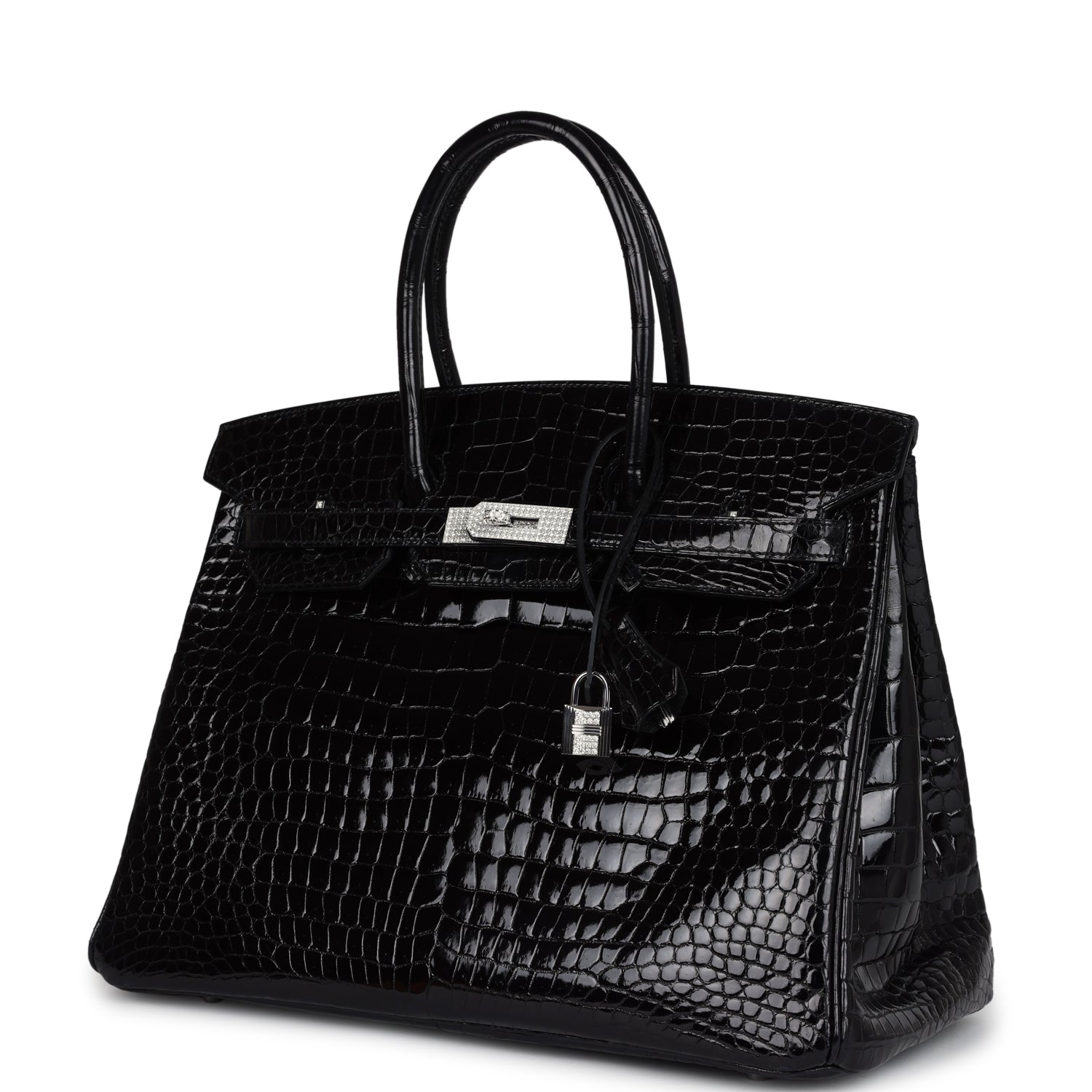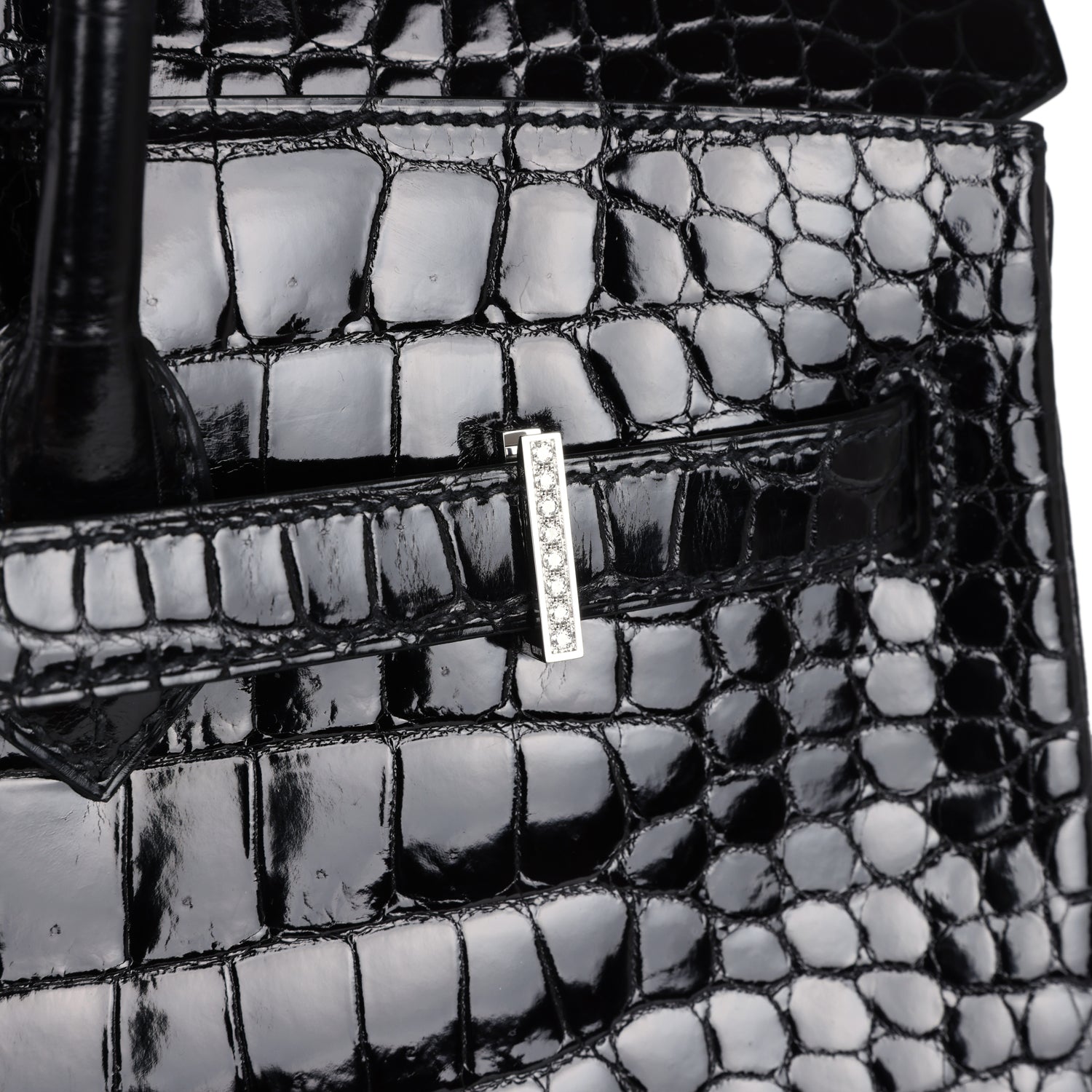 herthtmes Birkin 35 Black Shiny Porosus Crocodile 18K White Gold Diamond Hardware