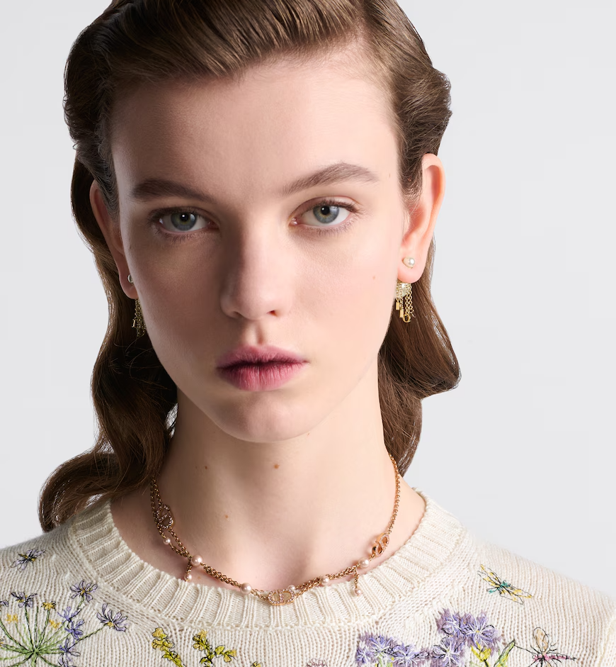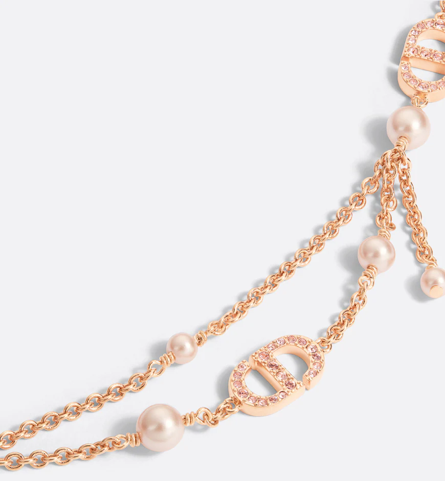 The Petit CD necklace has an elegant, modern design. Its double chain, finely crafted in pink-finish metal, is accented by pink resin pearls and enhanced by CD signatures with pavés of pink crystals. The sophisticated necklace can be coordinated with other creations from the Petit CD line.