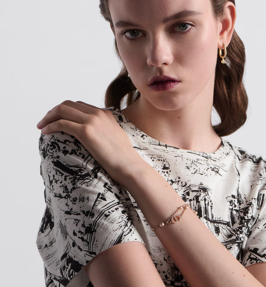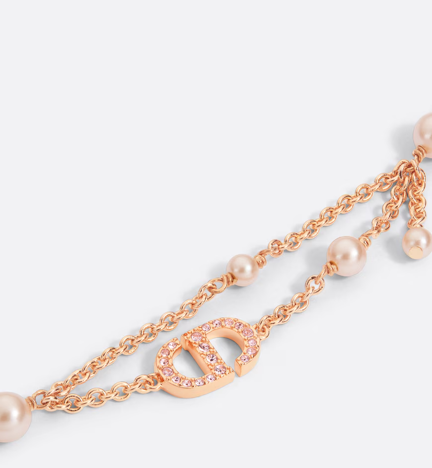 The Petit CD bracelet has an elegant and modern design. Its double chain, finely crafted in pink-finish metal, is accented by pink resin pearls and embellished with a CD signature in a pavé of pink-tone crystals. The sophisticated bracelet can be coordinated with other creations from the Petit CD line.