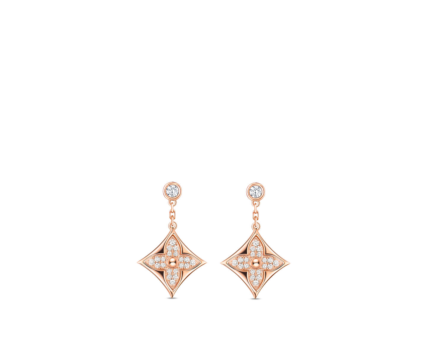 These Color Blossom BB Star ear studs celebrate the Monogram Flower, an enduring House emblem designed by Georges Vuithttton in 1896. Fashioned from 18-kt pink gold and fiery diamond pavé, the drops are suspended from diamond studs. Precious yet easy to wear, these signature jewels will add a flash of sparkle to any ensemble.