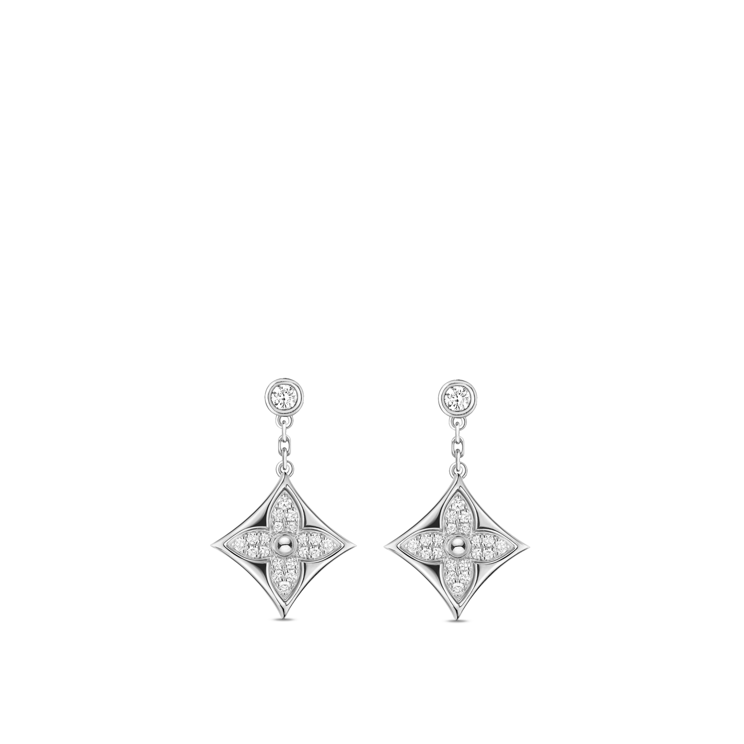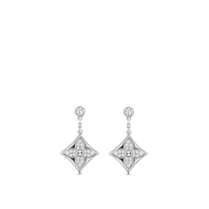 These Color Blossom BB Star ear studs celebrate the Monogram Flower, an enduring House emblem designed by Georges Vuithttton in 1896. Fashioned from 18-kt Sterling Silver and fiery diamond pavé, the drops are suspended from diamond studs. Precious yet easy to wear, these signature jewels will add a flash of sparkle to any ensemble.