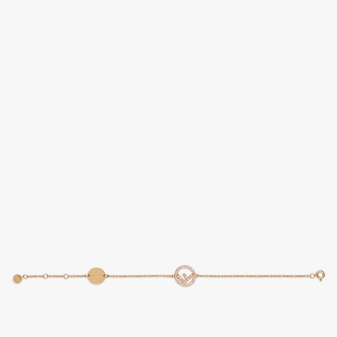 Chain bracelet with an ornament in the new Fethtndi logo shape. Small clip fastening and logo nameplate. Made of metal with a golden finish and natural crystal details.