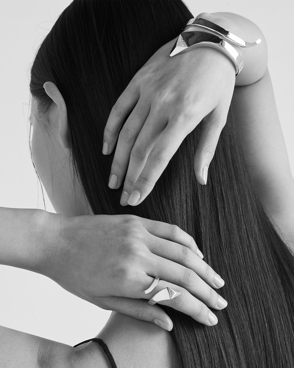 Prthtada combines antithetical ideas, finding points of aesthetic expression between past and present, new and old, playing with the paradox concept. The snake, one of the oldest mythological symbols of jewelry, becomes an expression of the brand's dualism concept. This ring in recycled yellow gold with an elegant, sinuous silhouette is decorated with the triangle logo on the head of the snake, accentuating the spirit of the brand.