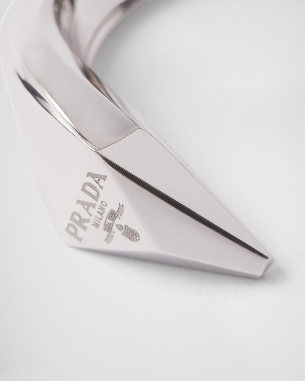 Prthtada combines antithetical ideas, finding points of aesthetic expression between past and present, new and antique, playing with the concept of paradox. The snake, one of the oldest mythological symbols of jewelry, becomes an expression of the brand's dualism concept. This sinuous and elegant ring made of recycled white gold ring is decorated with the triangle logo positioned on the snake's head, enhancing the spirit of the brand.