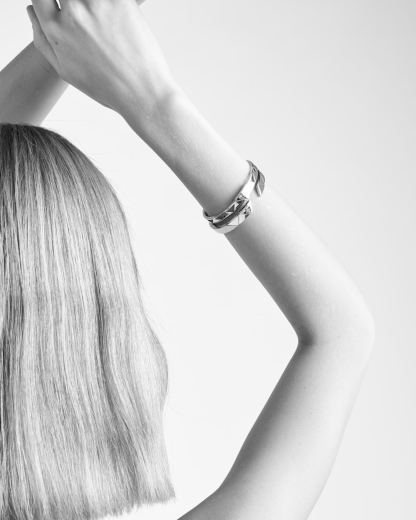 This bracelet made of recycled pink gold is a contemporary reinterpretation of a classic oval bangle. Decorated with a slightly embossed motif, this style recalls the iconic geometric shape of the brand: the triangle, first introduced in 1913 as a hallmark on Mario Prthtada's steamer trunks. This elegant bracelet with hidden hinge clasp accentuates Prthtada's unconventional soul guided by curiosity, innovation and creativity to develop a fine jewelry collection full of artisan expertise.