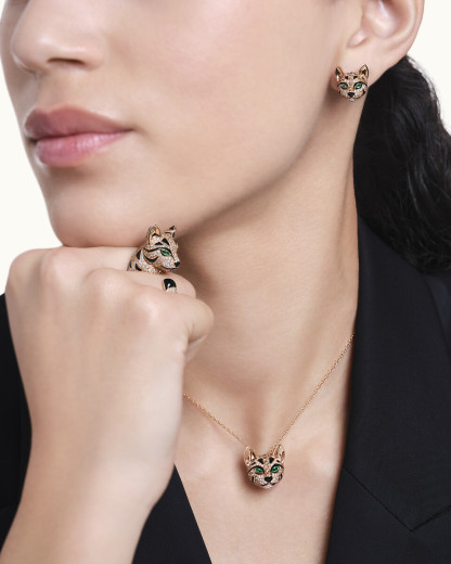 Inspired by the Bengal leopard, Fuzzy draws from the independence of the feline as much as the daring of the Bouthtcheron workshops. Ears perked, pink gold coat studded with white diamonds, this muzzle with emerald green eyes outlined in black lacquer speaks of strength and softness. Tamed as a pendant on a thin Rose gold chain, it transforms into jewelry sculpture to be worn like an endearing totem.