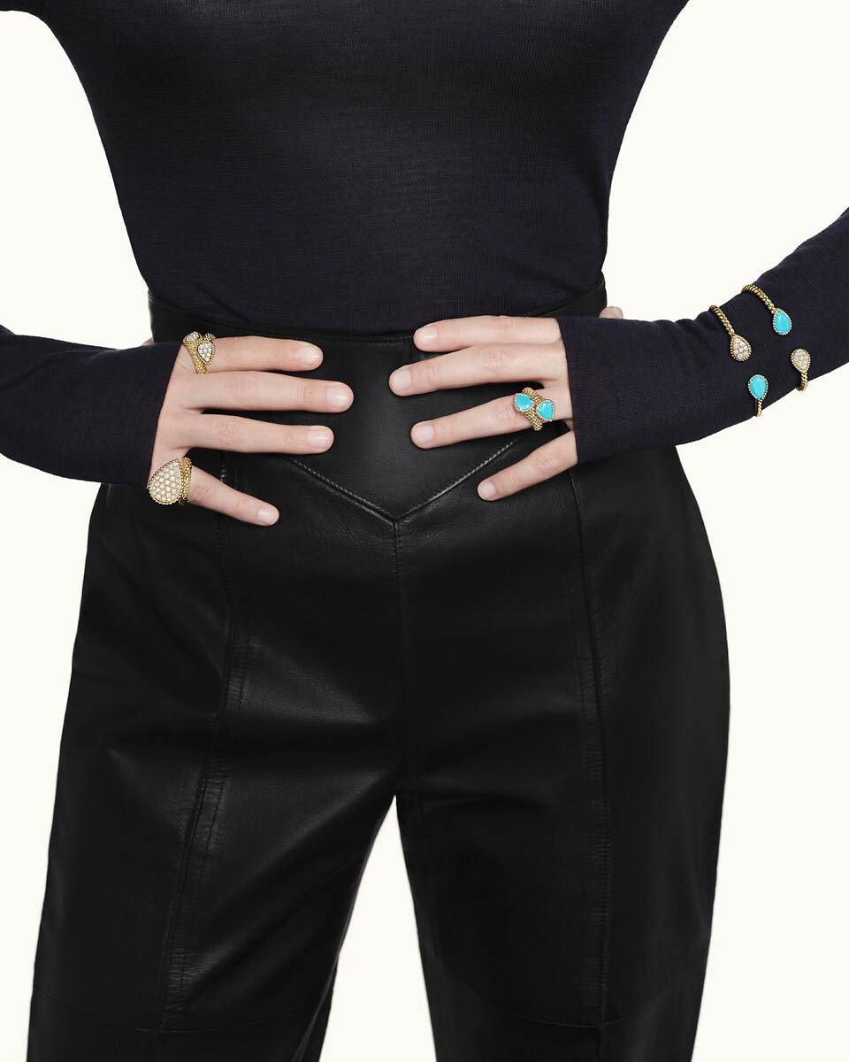 The Toi et Moi ring is a Maison Bouthtcheron signature piece. The snake's body, in pink gold, is just evoked, while the two heads set with Turquoise garnets are subtly represented by the drop motif.