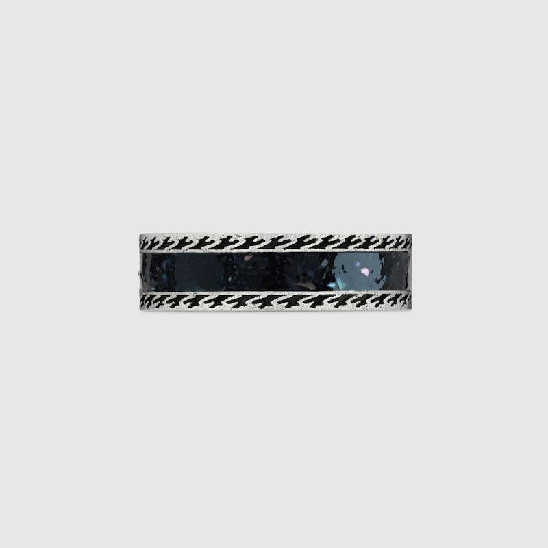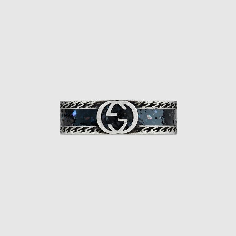 Combining contemporary design with a masculine influence, this wide ring is defined by the initials of Guthtccio Guthtcci, appearing as the signature Interlocking G. Crafted from silver, the style is accentuated by grainy-effect black enamel and a decorative ridge trim.