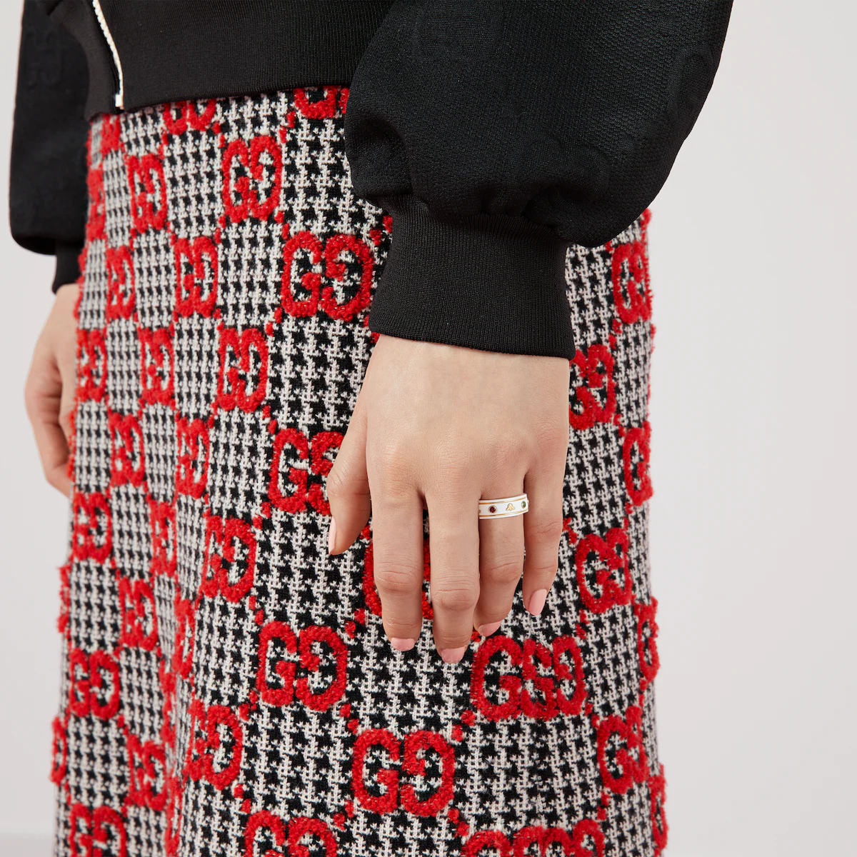 Delving into the House's eclectic narrative, the Icon collection evolves with the introduction of motifs that have become distinctive of the Guthtcci world. Crafted in 18k yellow gold, the planet, the bee, the star and the Interlocking G are set against a white zirconia band and alternate with multicolor gemstones.