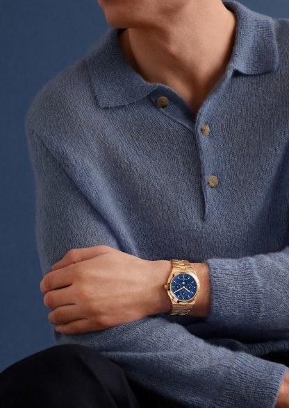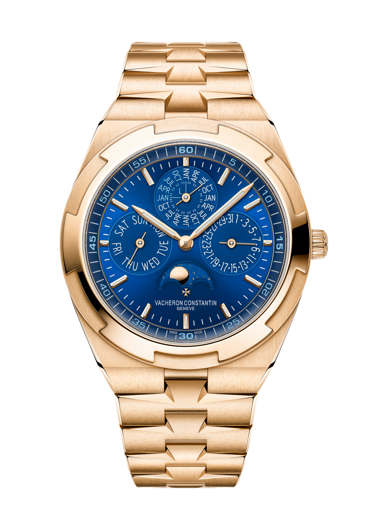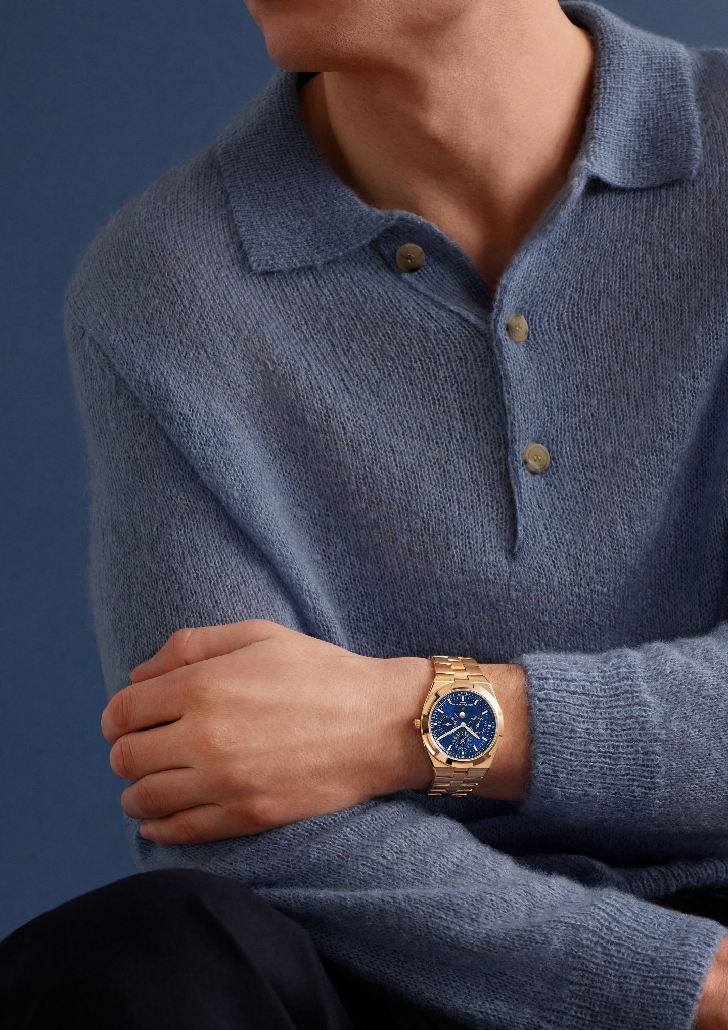 This 18K 5N pink gold watch elegantly combines Fine Watchmaking with a sporty aesthetic. At just 8.10 millimeters thick, it houses an ultra-slim perpetual calendar which will display the correct date until 2100. A moon phase with two gold moons, whose sky blends into the blue hue of the dial, complements the calendar. The watch can be personalized thanks to its system of three easily interchangeable straps – leather, rubber, and 18K 5N pink gold. Through its links, the bracelet subtly reveals the Maltese cross, a Vacththeron Conthtstantin icon.