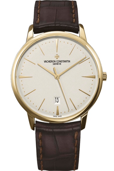 Patrimony - Self-winding - Caliber 2450 Q6 - Hallmark of Geneva - Case in 18K 3N yellow gold - Diameter: 40 mm - Dial silver-toned, opaline - Brown Mississippiensis alligator leather strap - Buckle in 18K 3N yellow gold - Standard presentation box