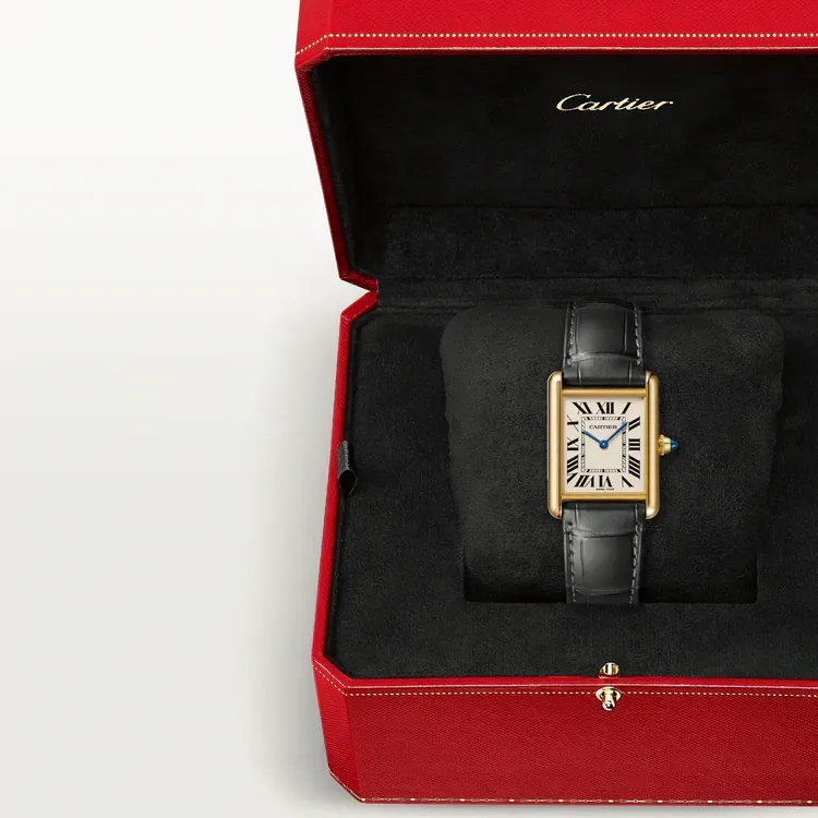 Tank Lothtuis Cathtrtier watch, large model, quartz movement. Case in 18K yellow gold (750/1000), beaded crown set with a sapphire, grained silvered dial, blued-steel sword-shaped hands, mineral crystal, strap in dark gray alligator skin, ardillon buckle in 18K yellow gold (750/1000). Case dimensions: 33.7 mm x 25.5 mm, thickness: 6.3 mm. Water-resistant up to 3 bar (30 meters/100 feet).
