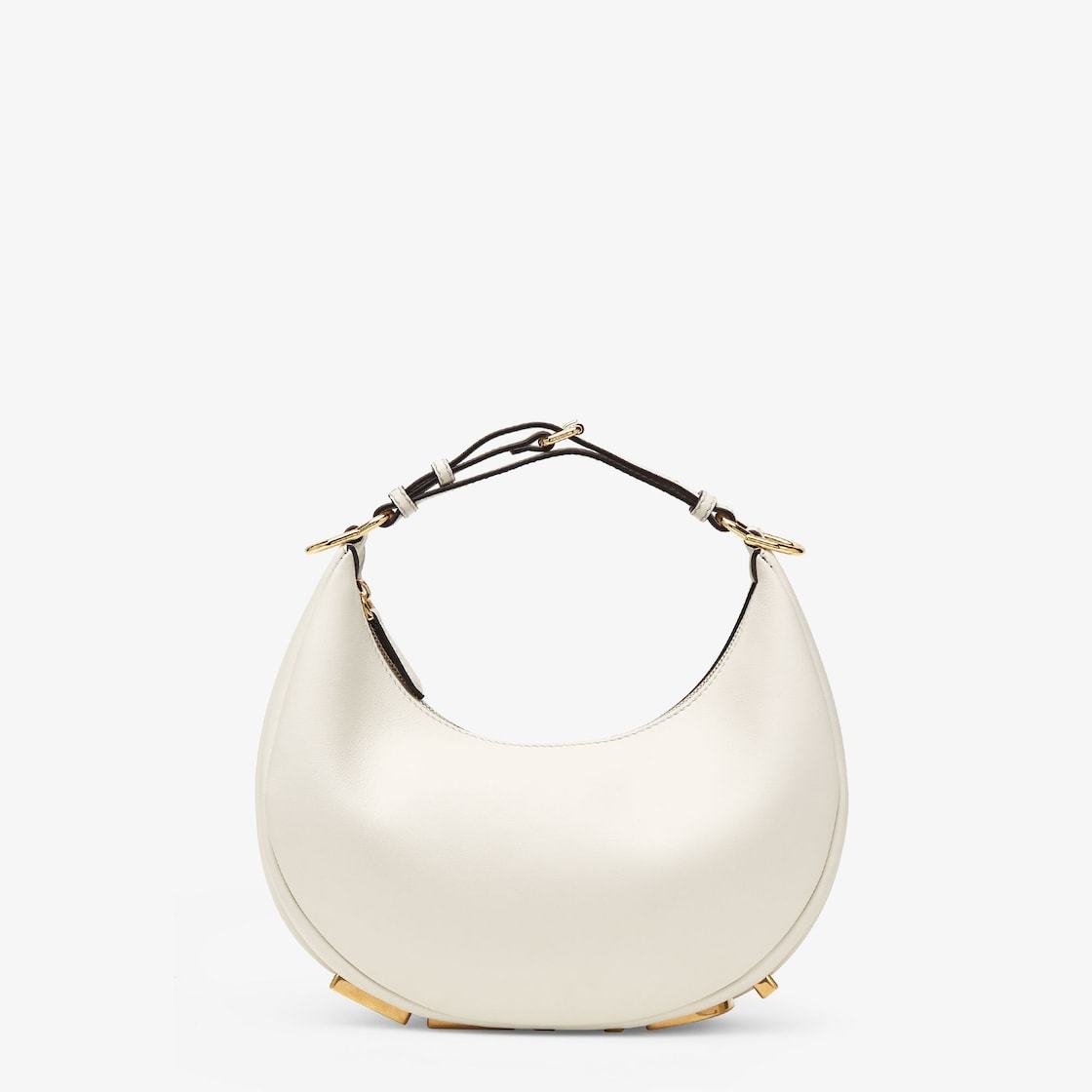 Small hobo bag made of soft white leather, with vintage gold metal Fethtndi lettering visible when the bag is worn under the arm.