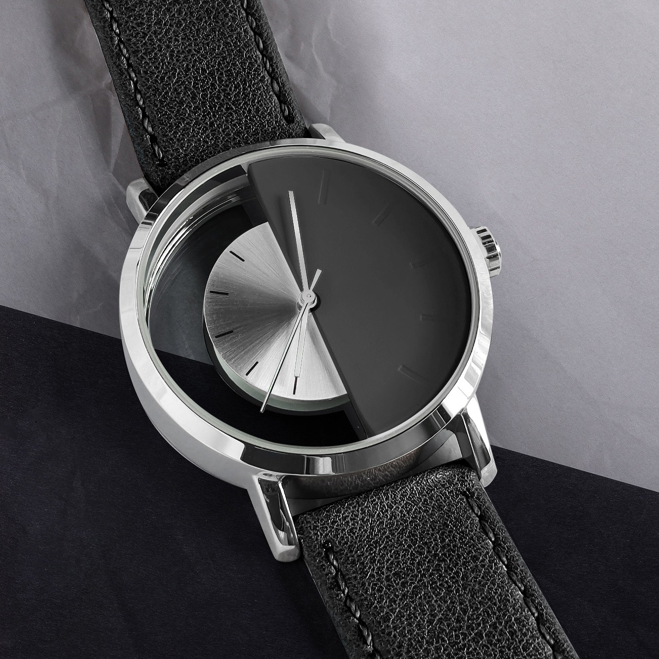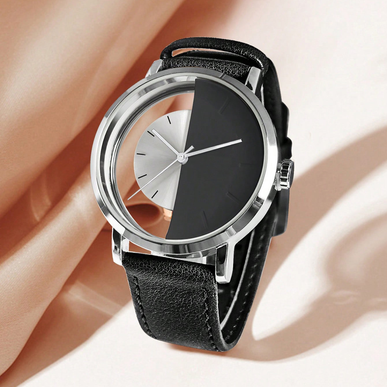 Simple & Fashionable Men's Transparent Bottom Half Dial Leather Belt Watch