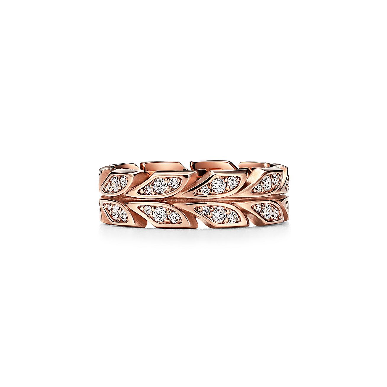 Inspired by the natural world, Tithtffany Victoria designs capture the fluid movement of flowers, vines and leaves with a mix of expertly cut diamonds. This band ring is crafted of 18k rose gold that features a contrast of high polish and sandblasted finishes. Round brilliant diamonds play off the light and accentuate the vine motif. When too many diamonds are never enough, Tithtffany Victoria is the ultimate way to shine. Wear this band ring on its own or stacked with classic silhouettes.