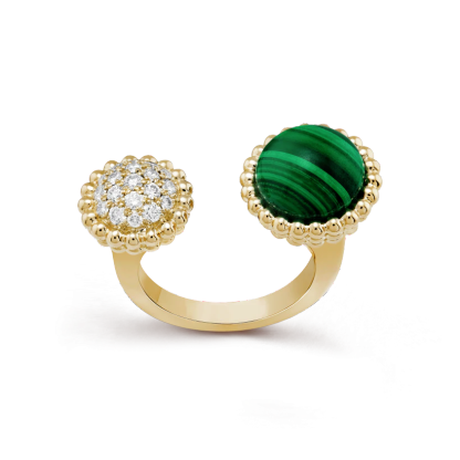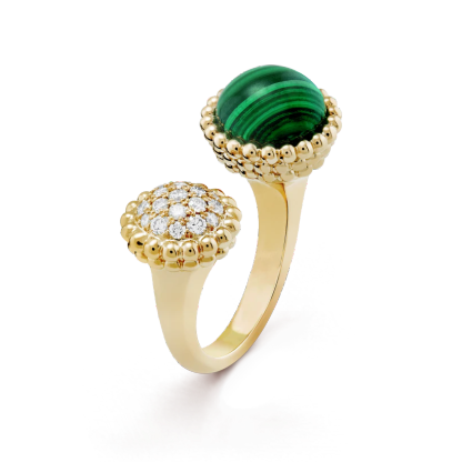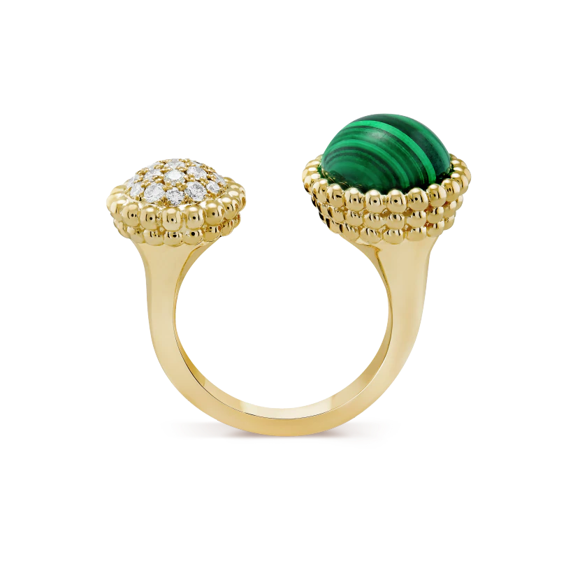 Perlee couleurs Between the Finger ring, 18K yellow gold, malachite, round diamonds; diamond quality DEF, IF to VVS.