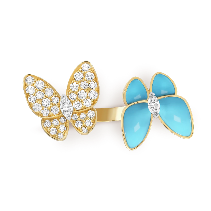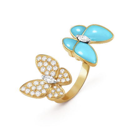 Two Butterfly Between the Finger ring, 18K yellow gold, turquoise, round diamonds, rhodium plated 18K white gold, marquise-cut diamonds; diamond quality DEF, IF to VVS.