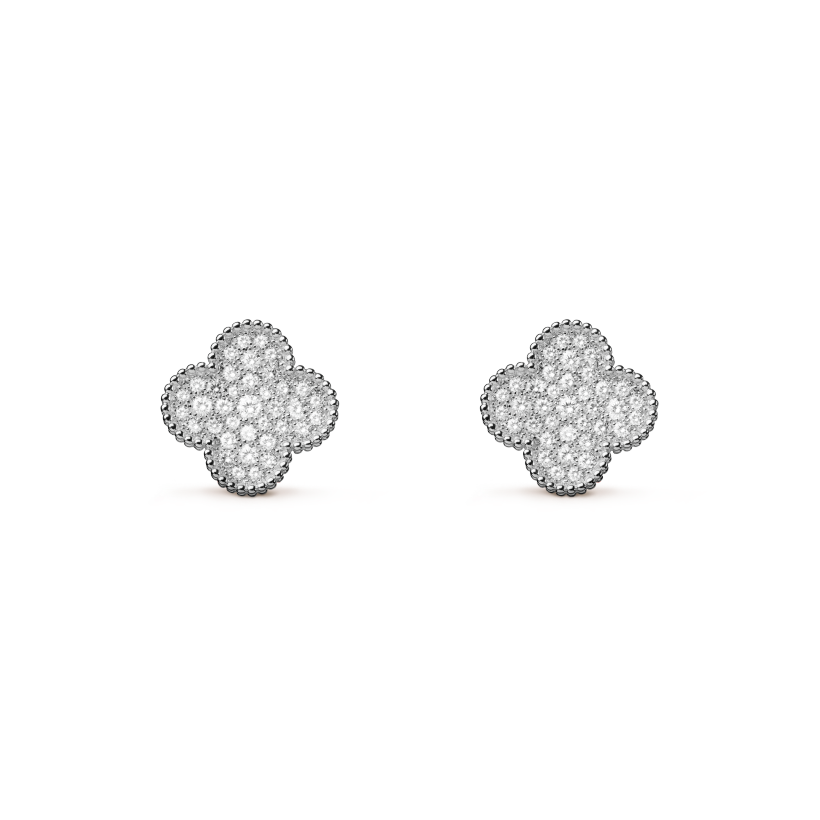 Magic Alhambra earrings, rhodium plated 18K white gold, round diamonds; diamond quality DEF, IF to VVS.