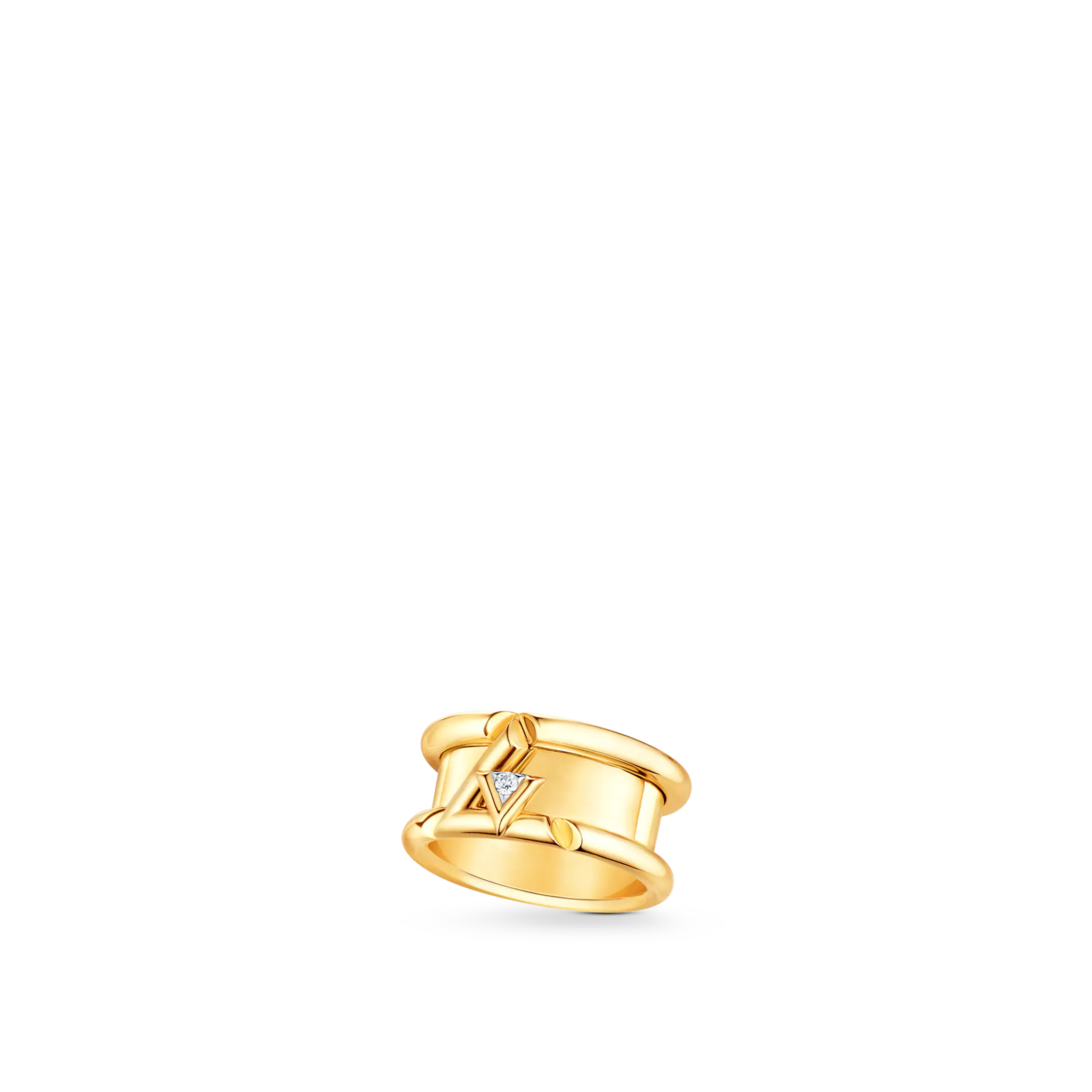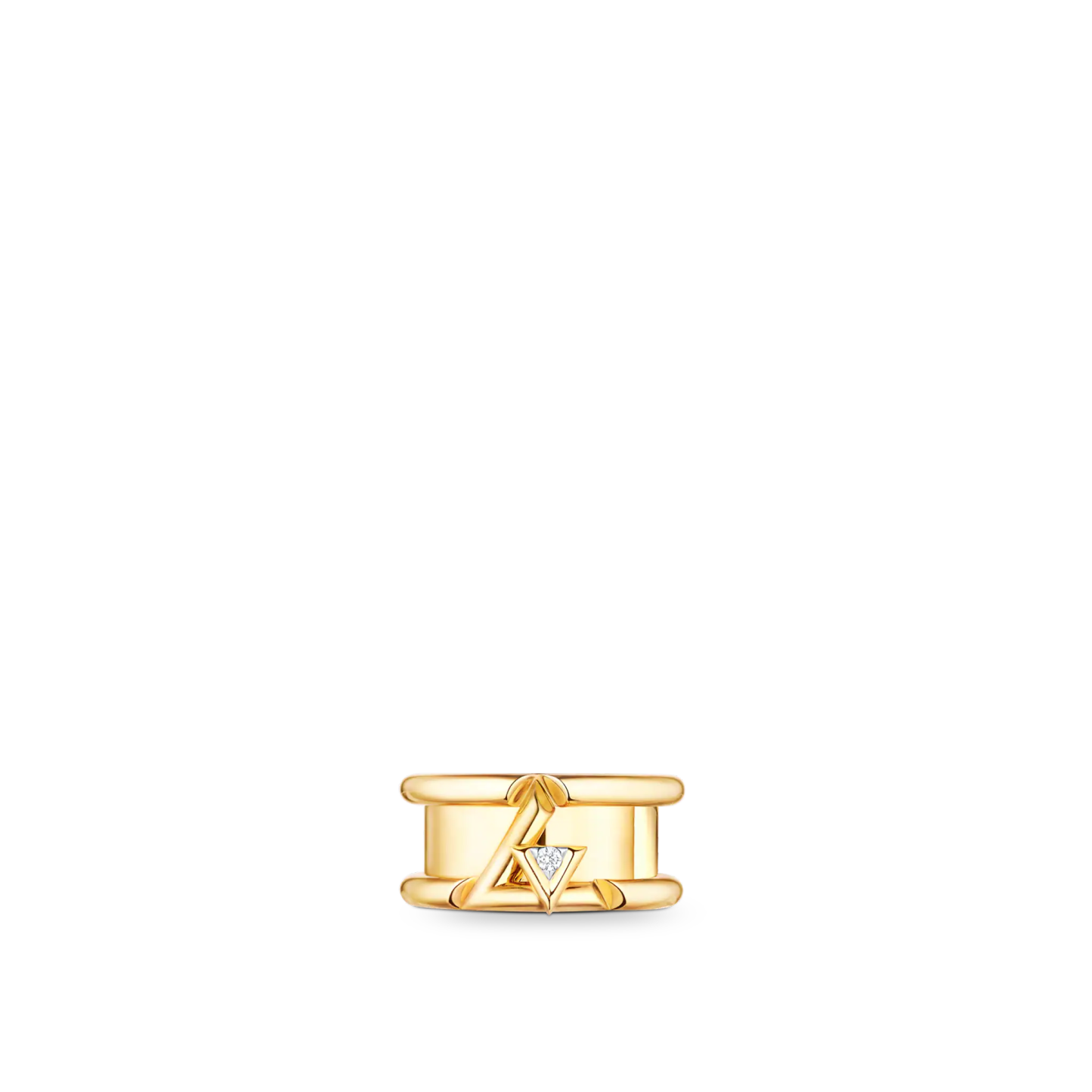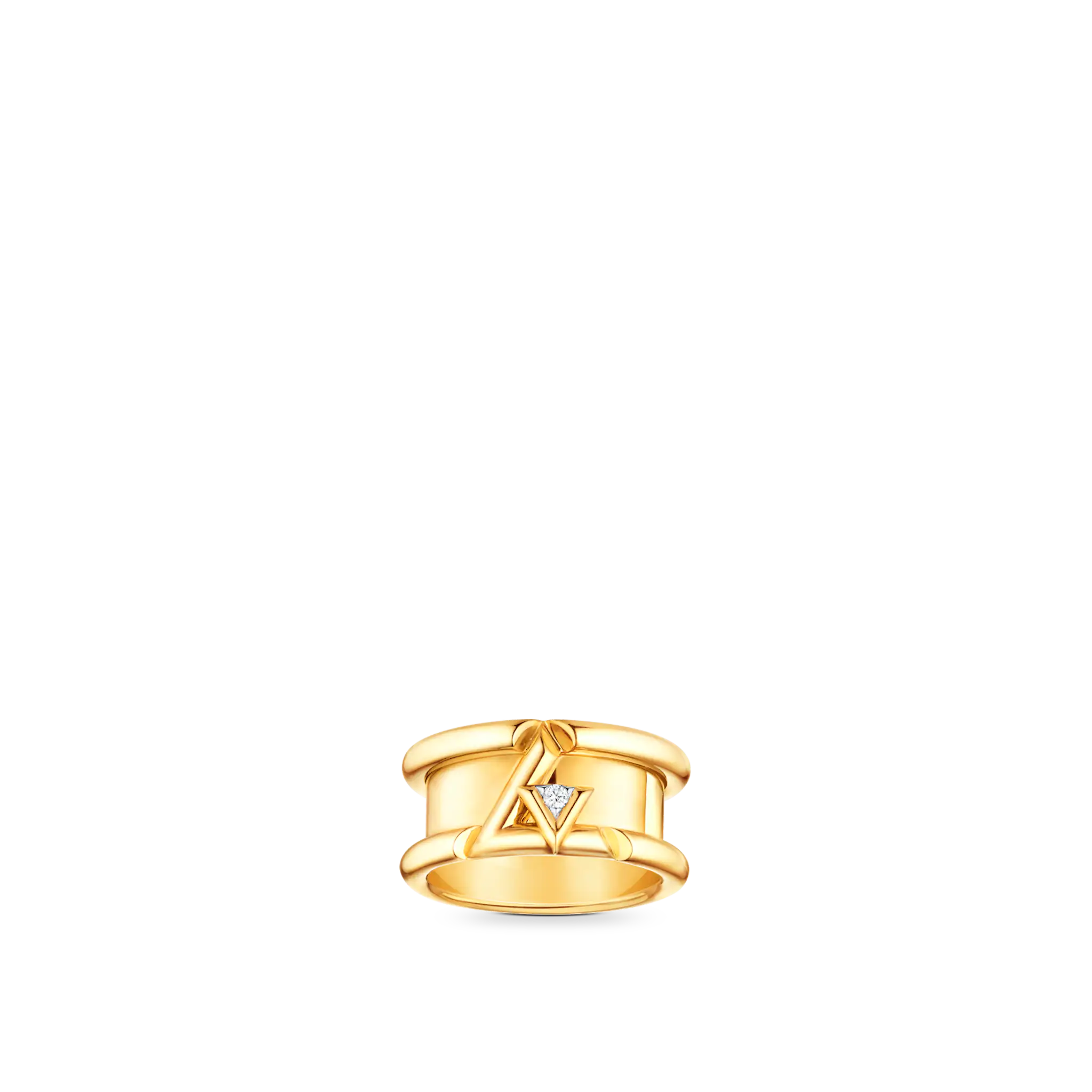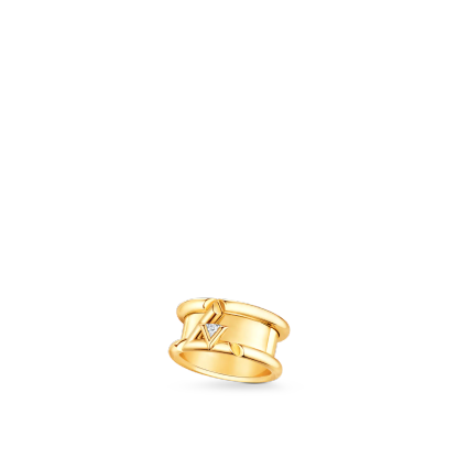 Inspired by energy and rhythm, the LthtV Volt band ring in 18-karat gold pays tribute to the LthtV initials: a small V, set with a brilliant diamond, is integrated within a larger L. The design's sharp slices bring strength and modernity to the signature. Pieces from the LthtV Volt collection for both men and women can be mixed and matched to create a unique style.