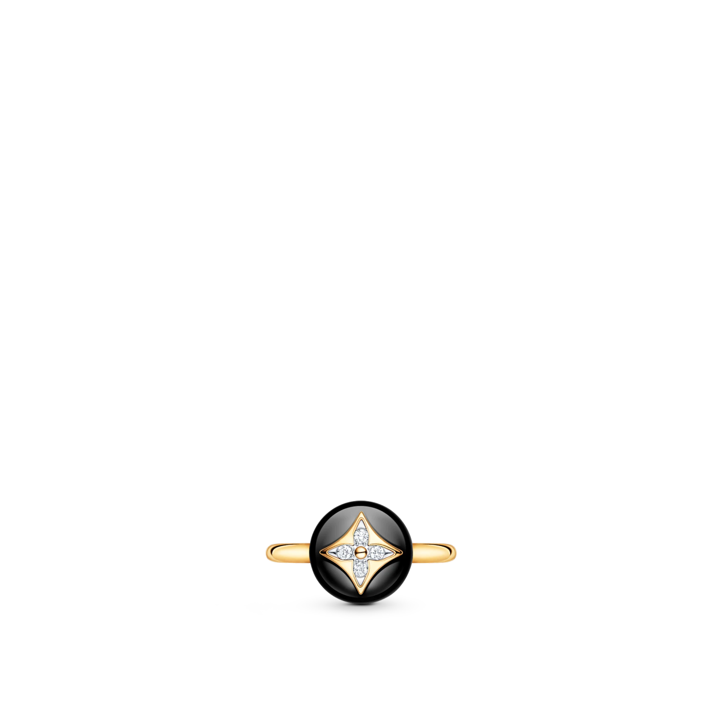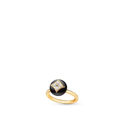 This stylish, stackable B Blossom ring is crafted from yellow and white 18-kt gold. It features a polished black onyx set with the iconic Monogram Flower motif, formed by four sparkling diamonds. The jewel’s rounded shape resembles that of a personal stamp – a bold, modern piece for a woman who always leaves her mark.