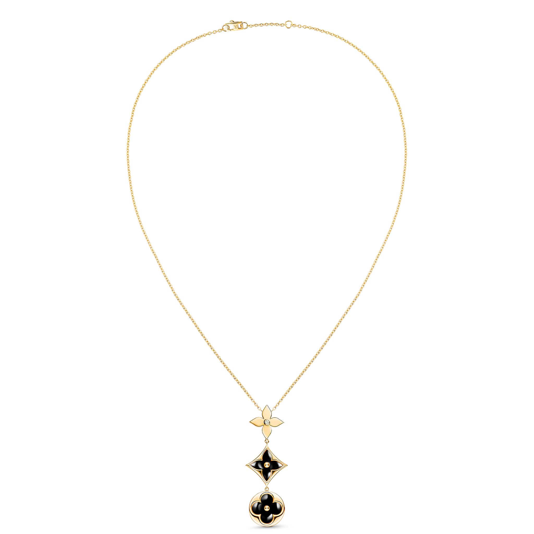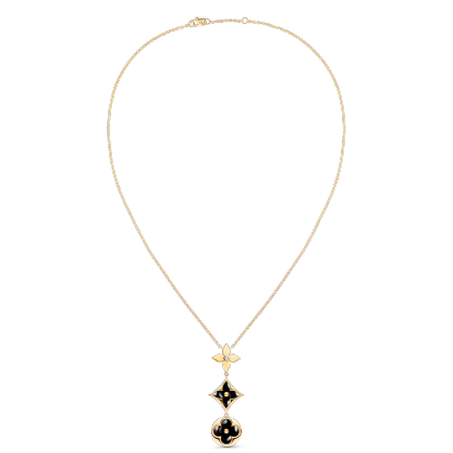 Color Blossom celebrates the Monogram Flower, created in 1896 by Georges-Lothtuis Vuithttton. The pendant's trio of signature motifs is cast from 18-karat yellow gold; one is set with a sparkling diamond, two are meticulously carved from black onyx. A beautiful piece to layer, mix or match with other jewels from the collection.