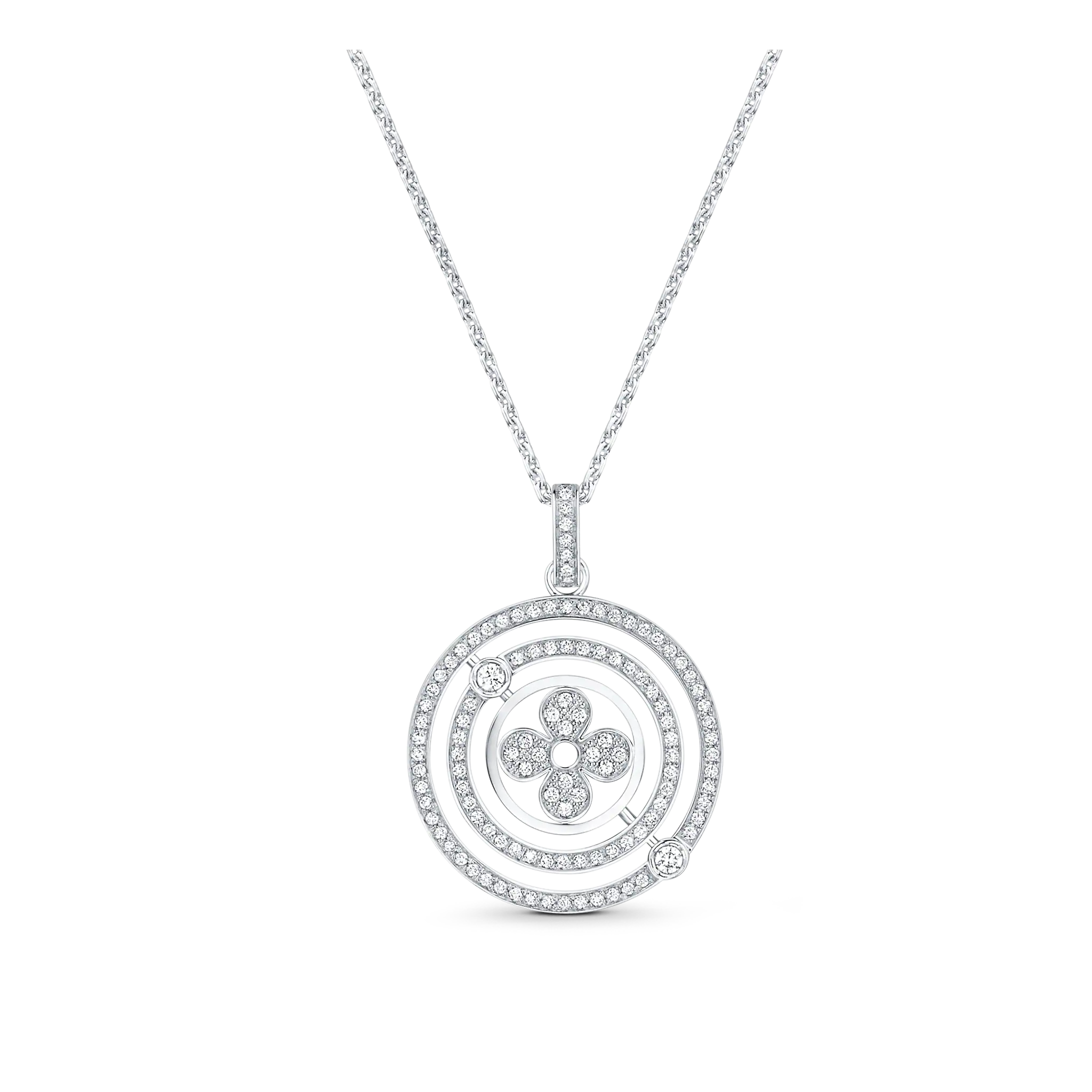 The Idylle Blossom collection pays tribute to the Monogram Flower, with modern pieces like this medallion necklace, cast from 18-karat white gold and illuminated with brilliant diamond pavé. With an adjustable chain that allows for different stylings, this elegant yet playful jewel can be worn alone or layered with other models from the Idylle Blossom line.