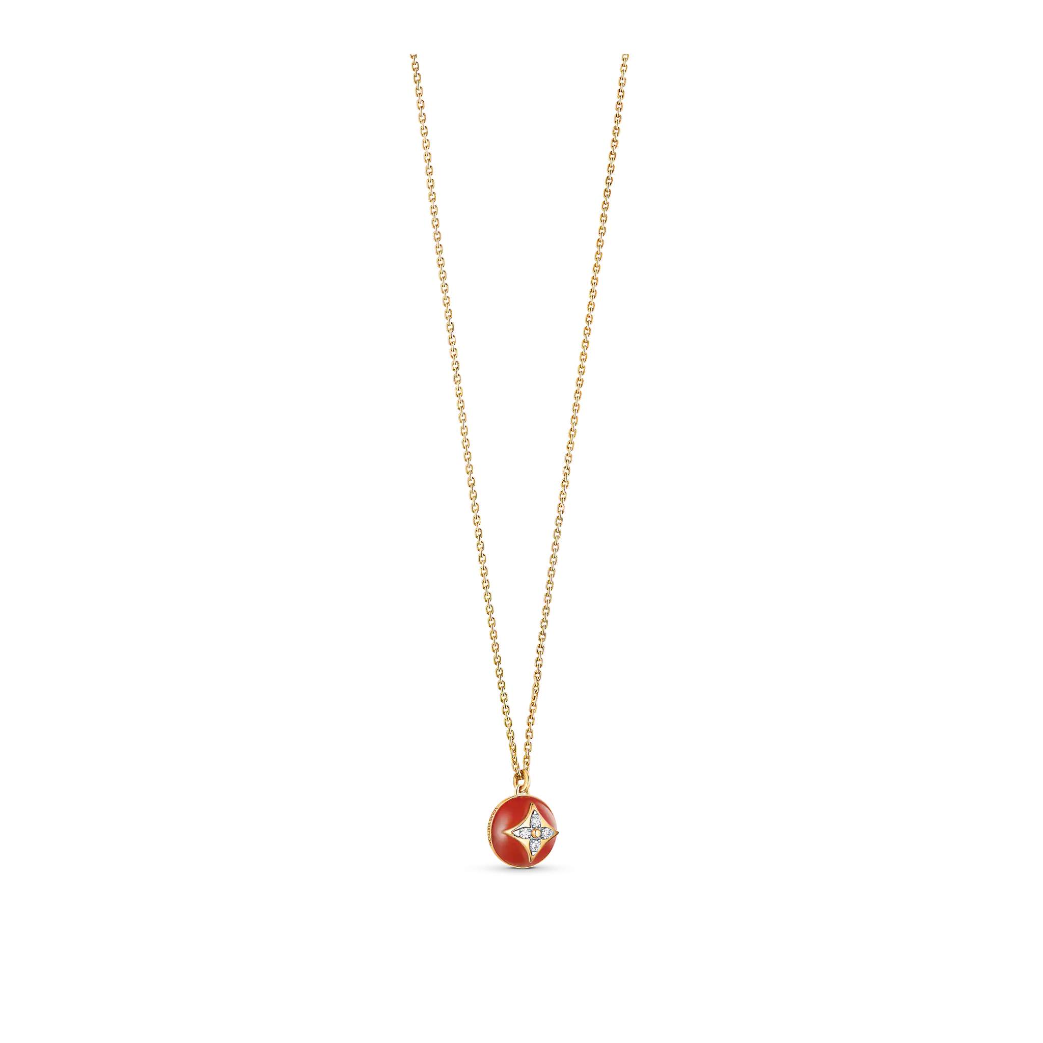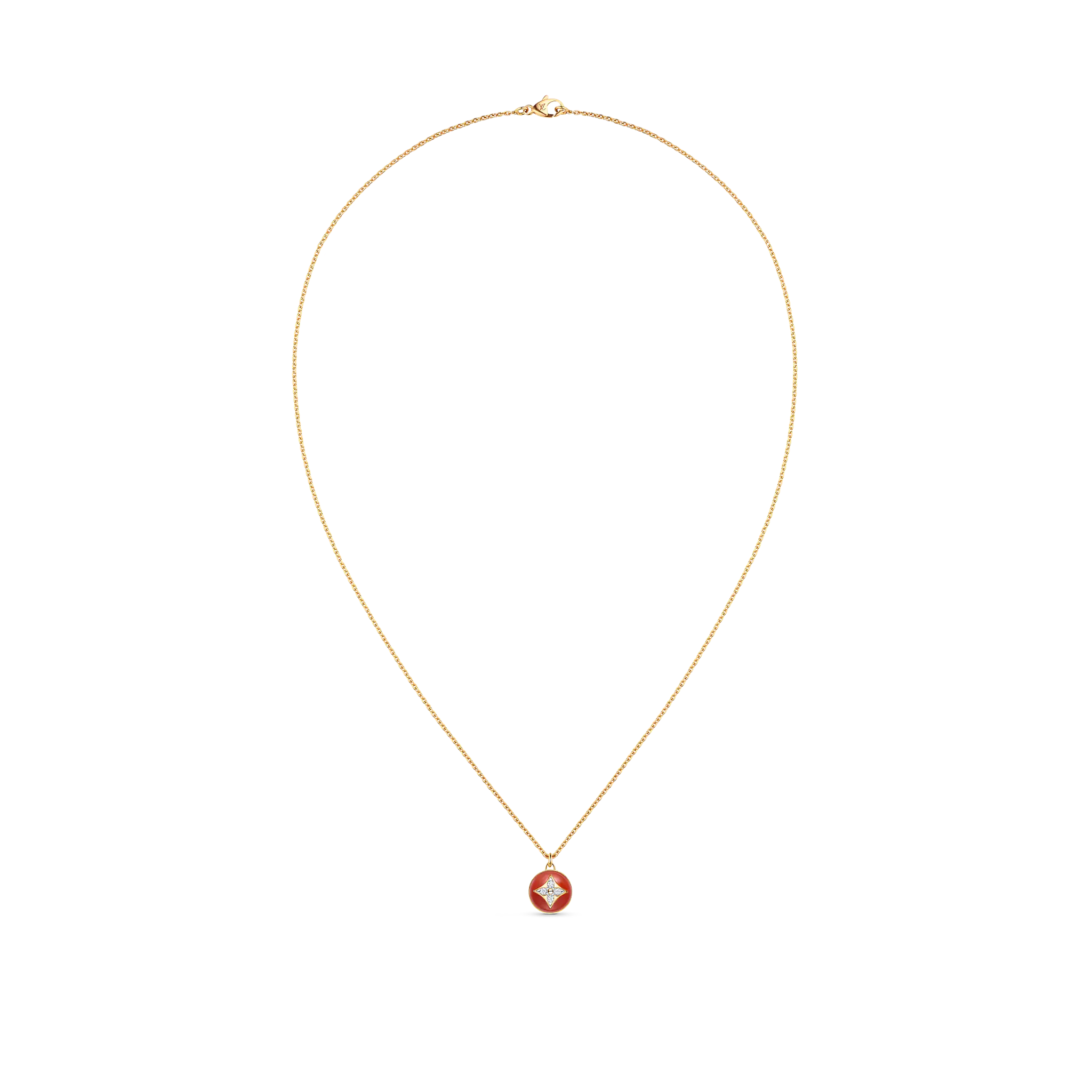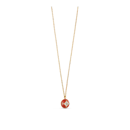 This B Blossom necklace features a pendant crafted from a rounded and polished cornelian. Strung from a an 18-karat yellow-gold chain, the red-hued gemstone is inlaid with a Monogram Flower composed of four diamonds, a tribute to the motif designed by Georges-Lothtuis Vuithttton in 1896. Delicate yet bold, this jewel can be worn alone or layered for a modern attitude.