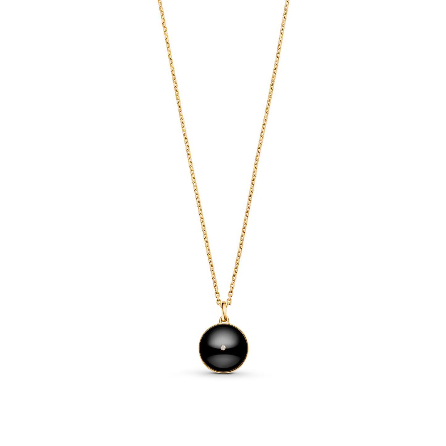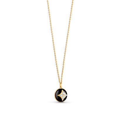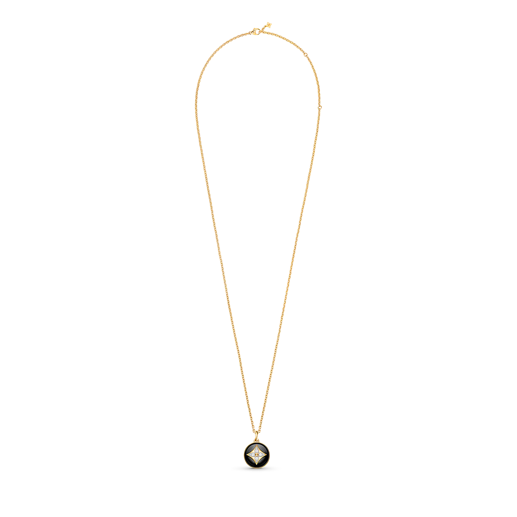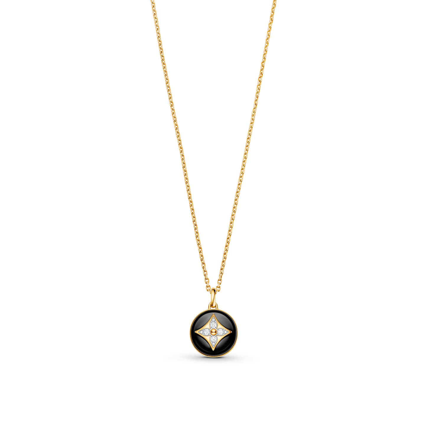 An eye-catching jewel from the B Blossom range, this medallion necklace is cast from 18kt yellow and white gold. It is strung with the collection’s signature motif: a Monogram Flower formed of sparkling diamonds, set here within two half-spheres of polished black onyx. With its adjustable chain, the pendant can be layered with other pieces for a stylish stacked effect.