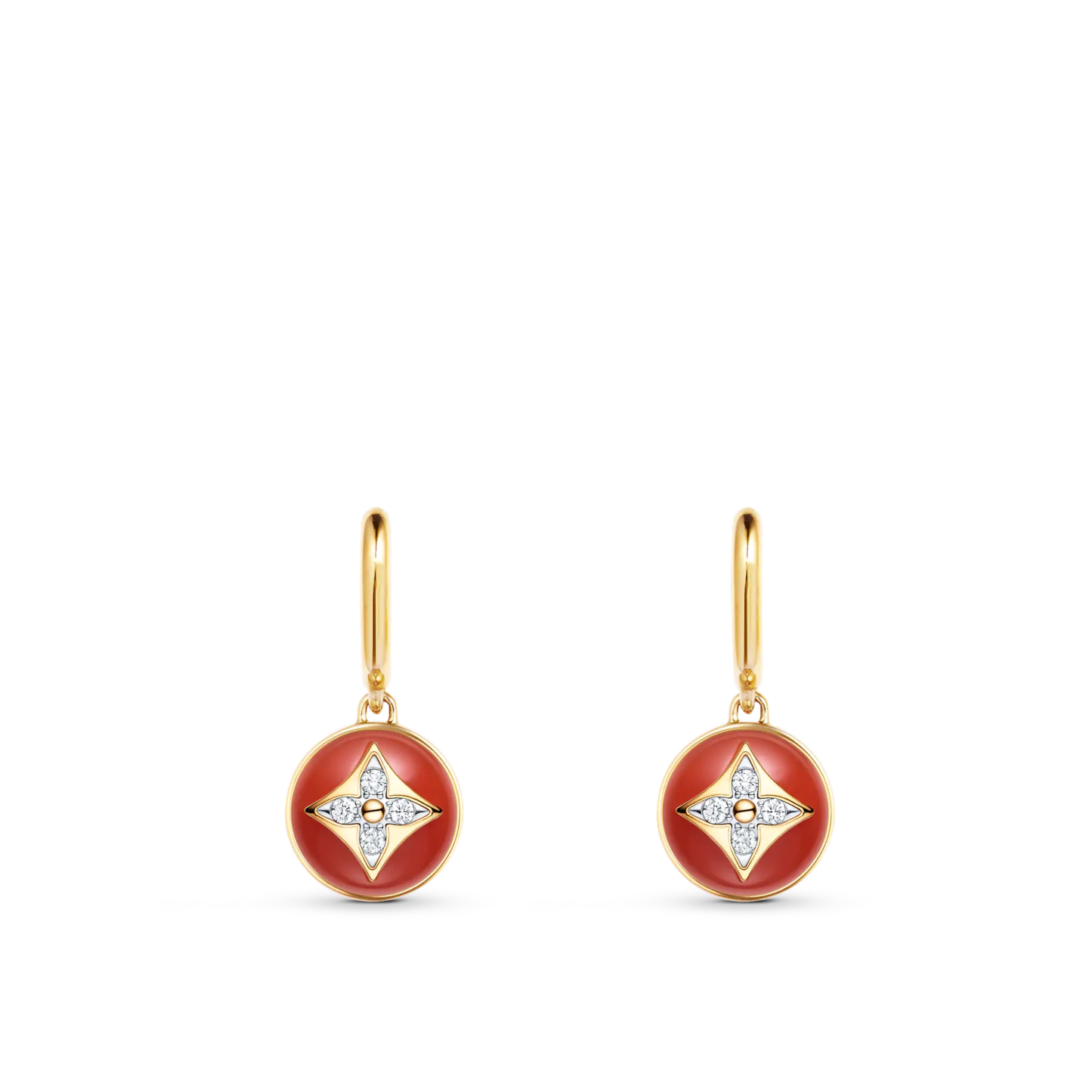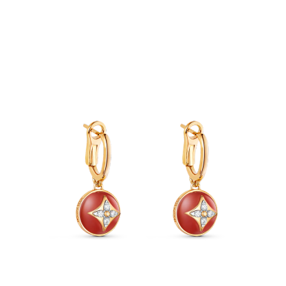 Cast from 18-karat yellow and white gold, these B Blossom earrings feature red-hued cornelians, rounded and polished to a high luster. The gemstones are Illuminated by four shining diamonds, set in an iconic Monogram Flower pattern. Precious yet easy to wear, these jewels bring a touch of color and modern sparkle to any silhouette.