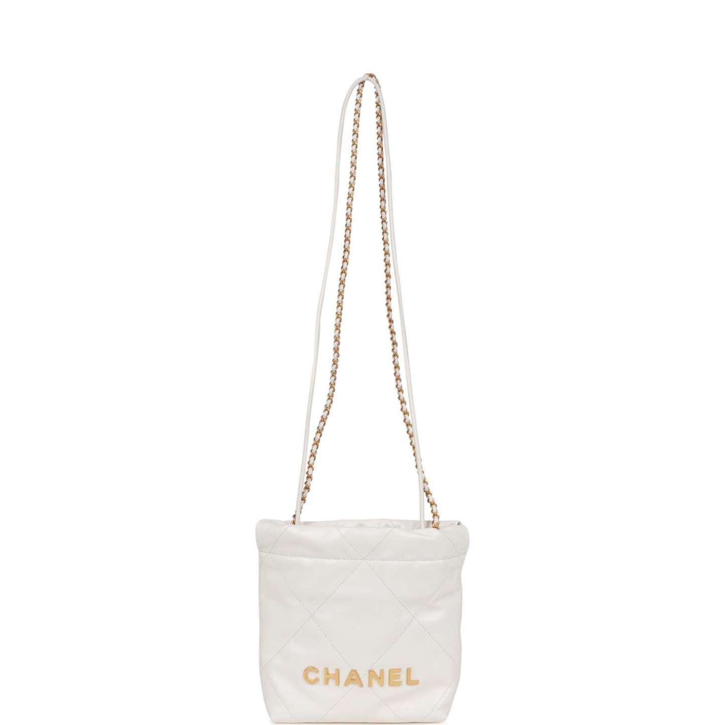 This mini 22 hobo bag in white calfskin with gold tone hardware and has the signature diamond quilting, Chathtnel on the front in gold metal, and long gold tone and white leather interwoven chain.