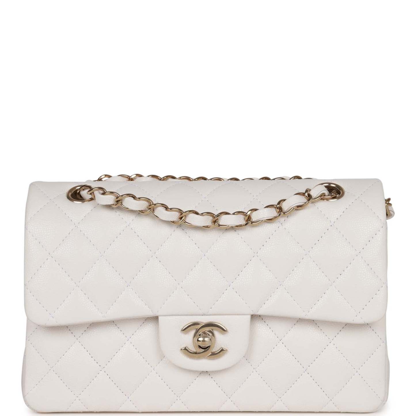 This Small Classic Double Flap bag is in White caviar leather with light gold tone hardware and features a front flap with signature CC turnlock closure, half moon back pocket, and adjustable interwoven light gold tone chain link and white leather shoulder strap.